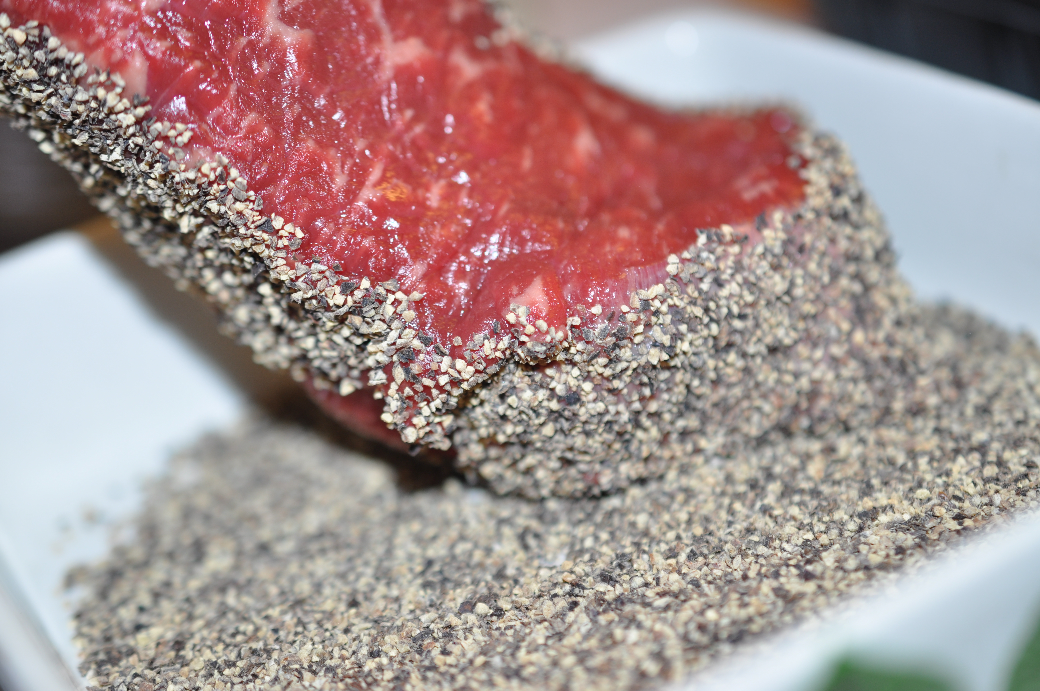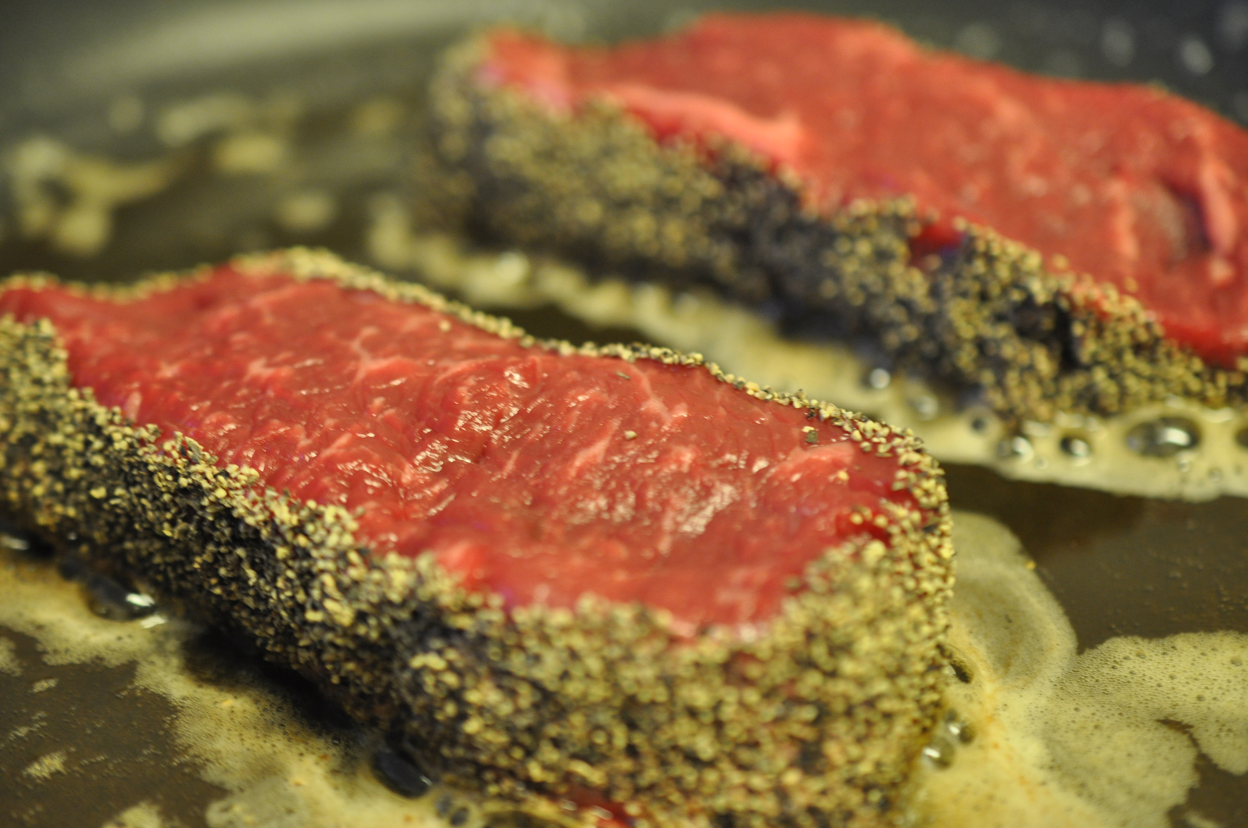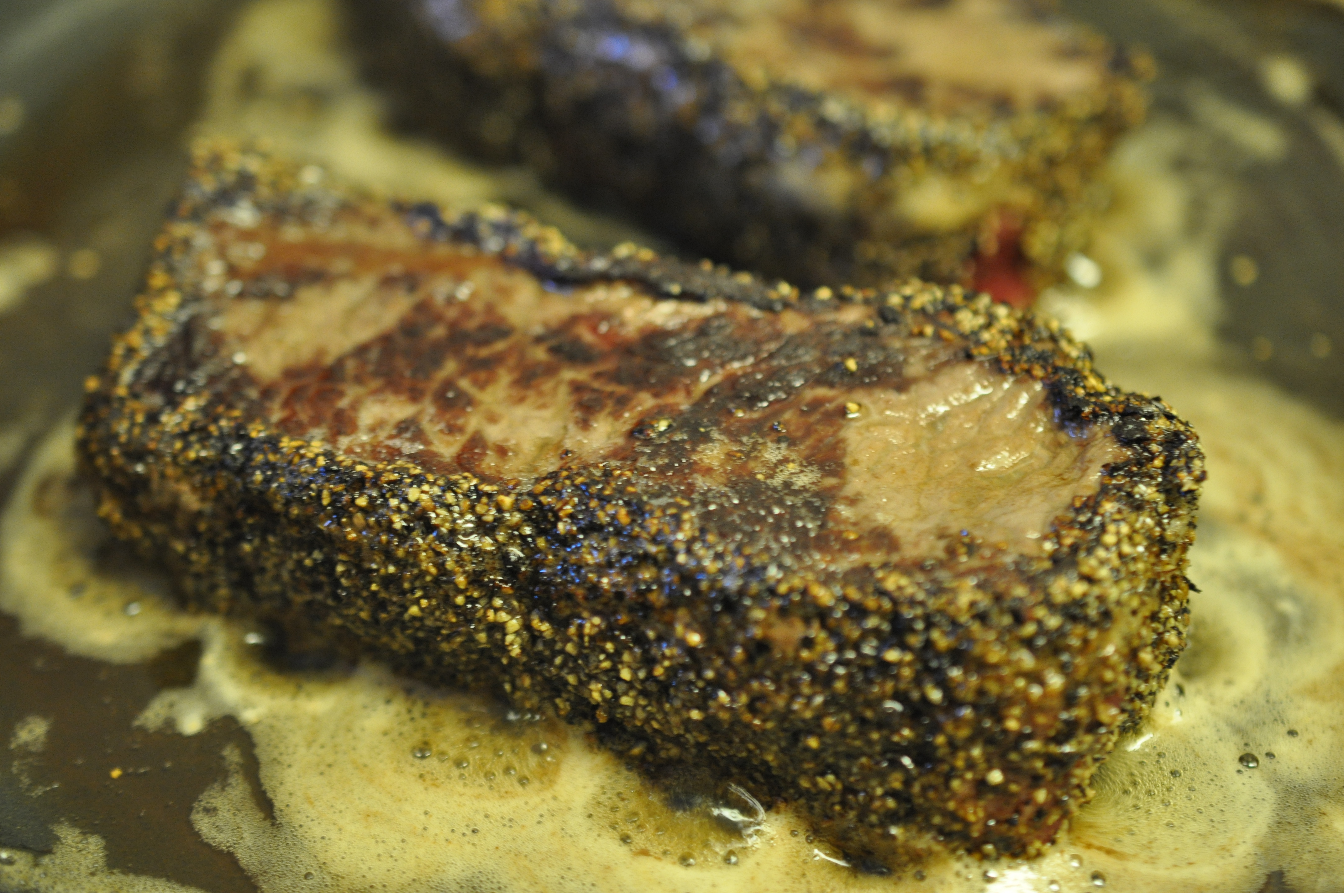 Brynte smöret i stekpannan på medelhög värme. Under tiden så kryddades ryggbiffen med grovpepparn på sidorna. Sen kryddades den med peppar och salt och stektes på medelhög värme på stekpannan i ca 2 minuter per sida.