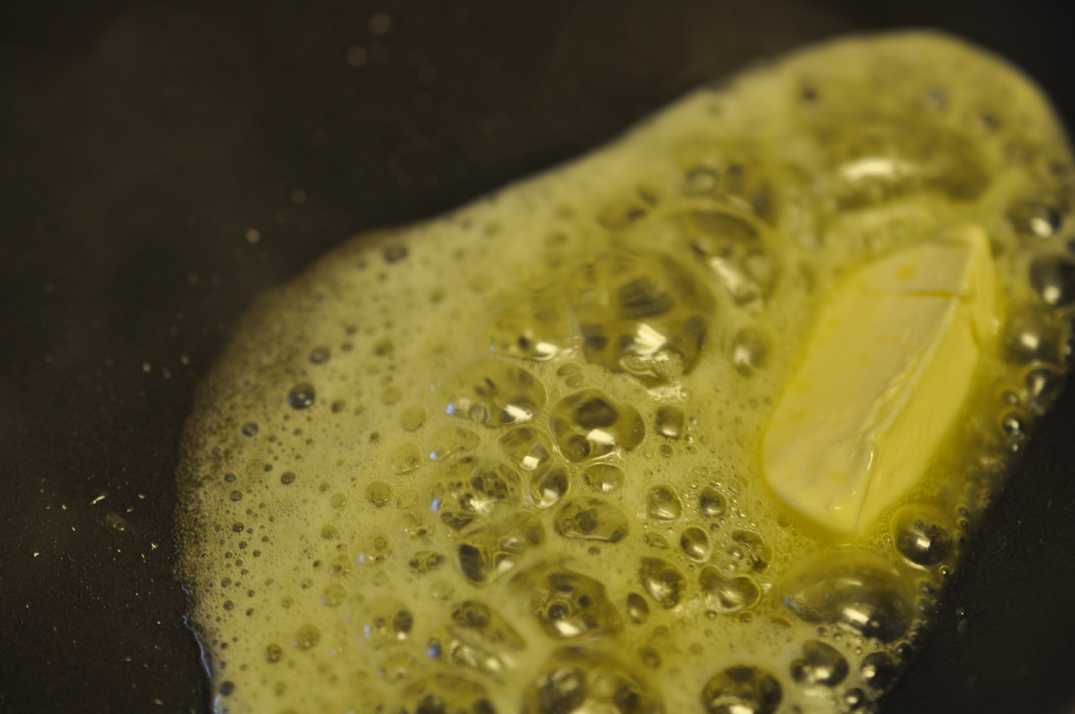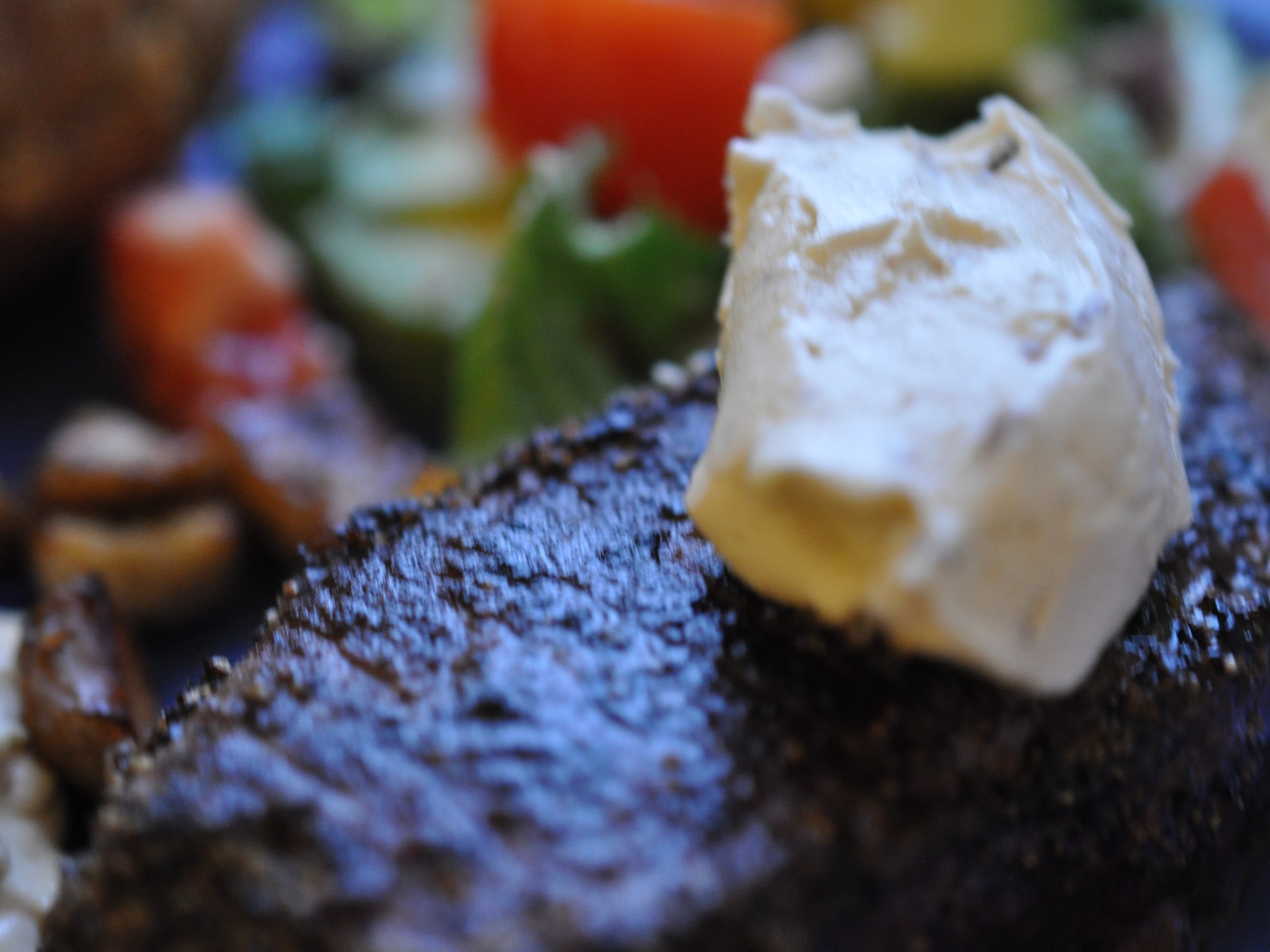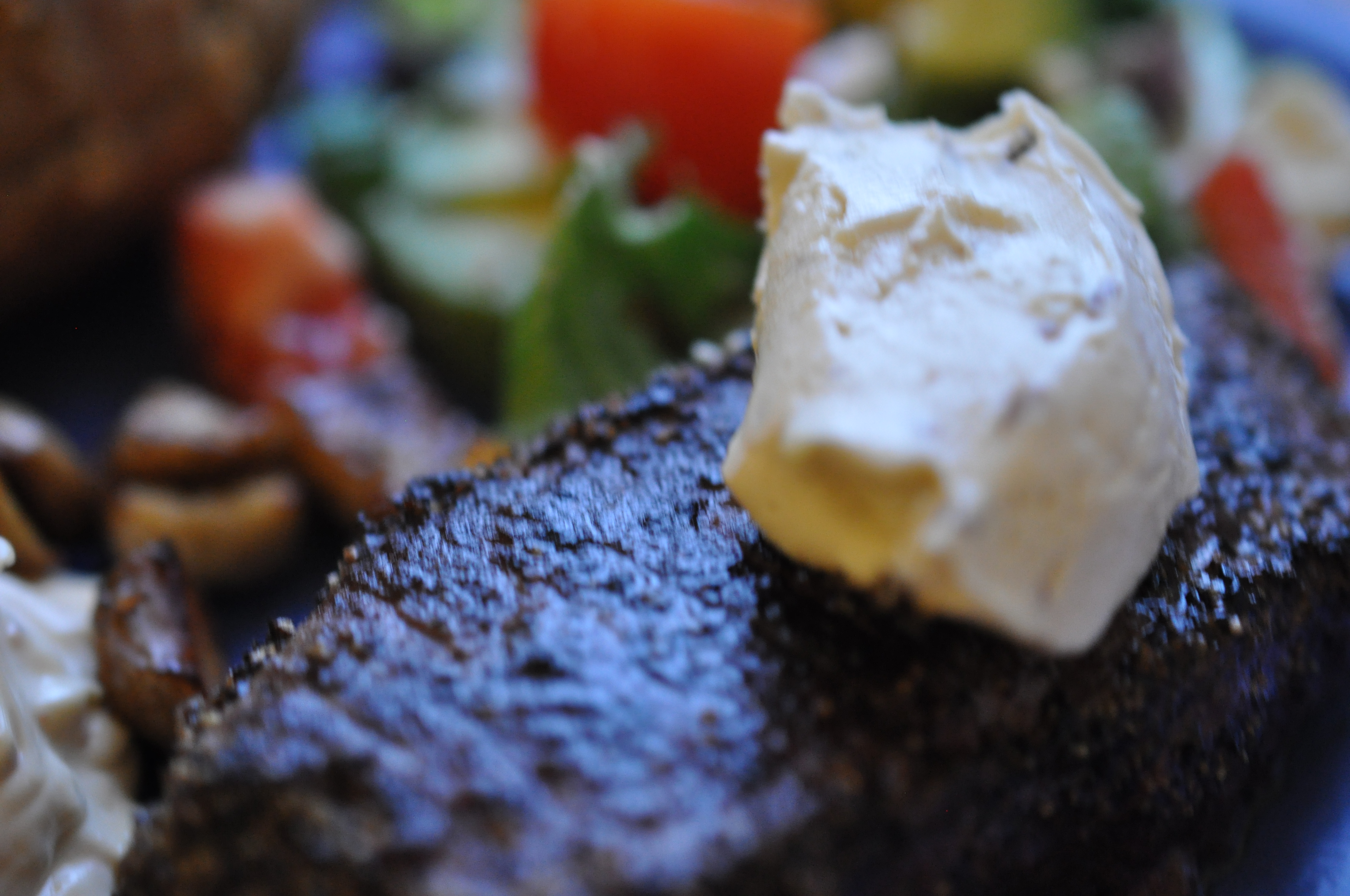 Brynte smöret i stekpannan på medelhög värme. Under tiden så kryddades ryggbiffen med grovpepparn på sidorna. Sen kryddades den med peppar och salt och stektes på medelhög värme på stekpannan i ca 2 minuter per sida.