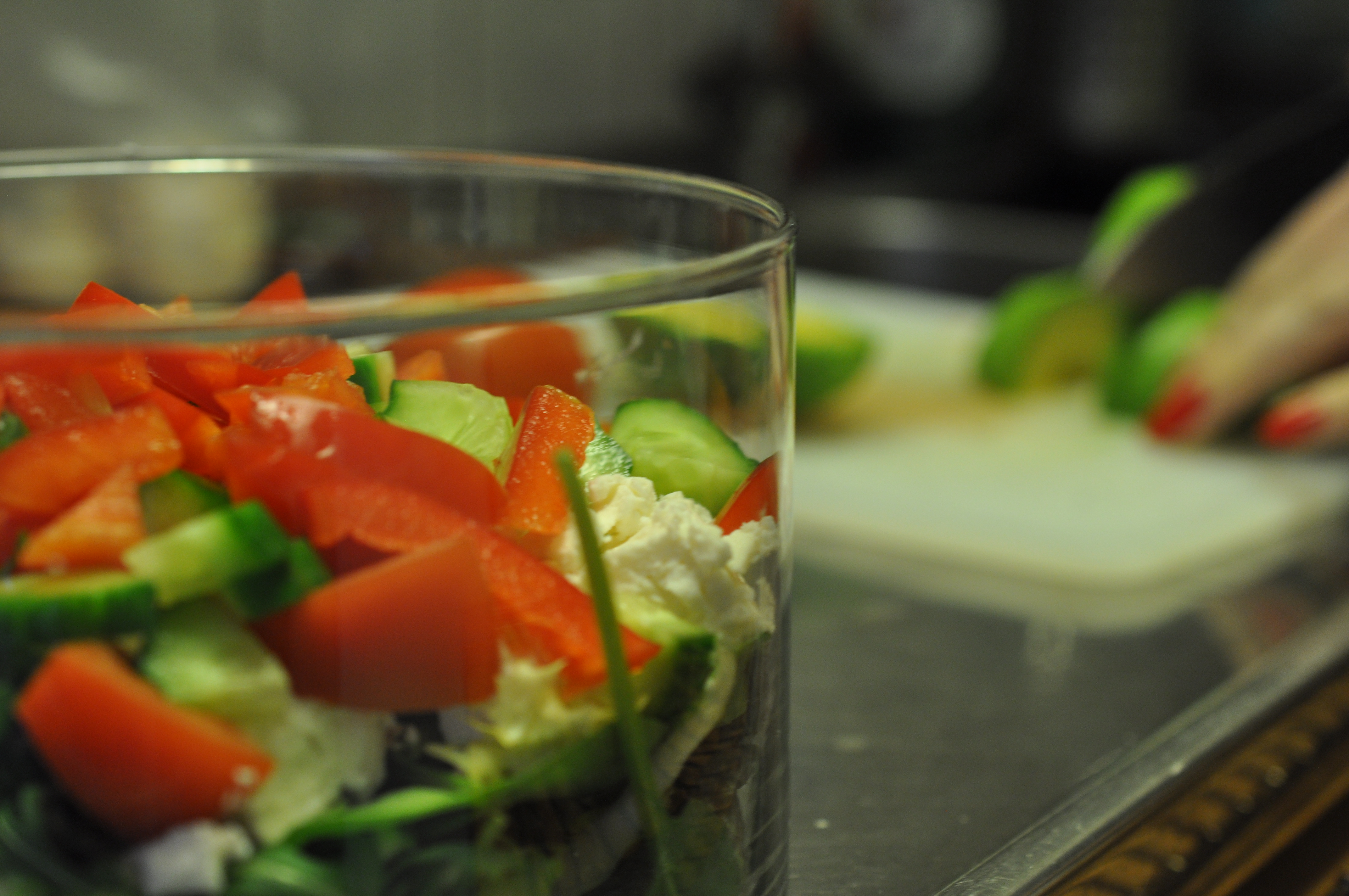 Sallad; som bestod av 4 olika sorters grönsallad, gurka, paprika, tomater, avokado och feta ost.