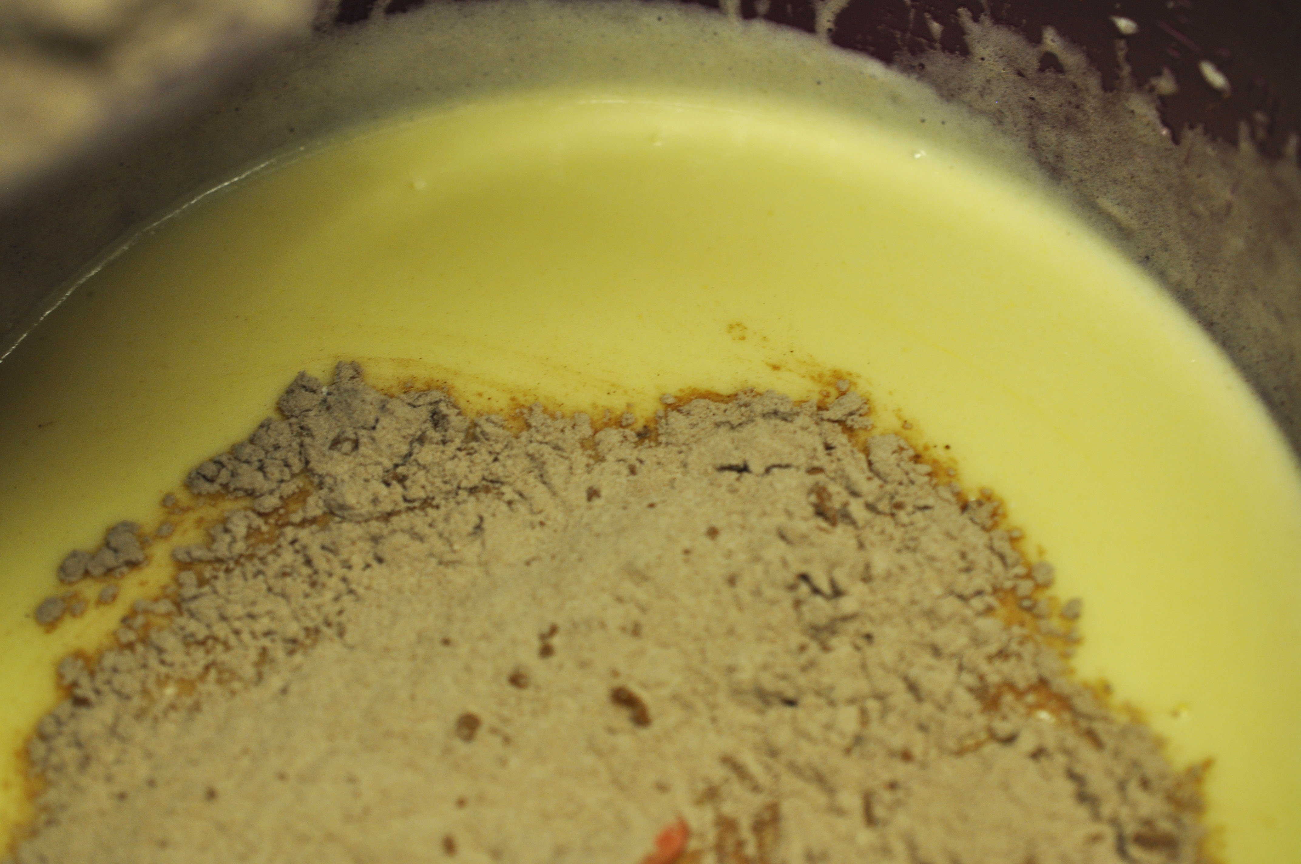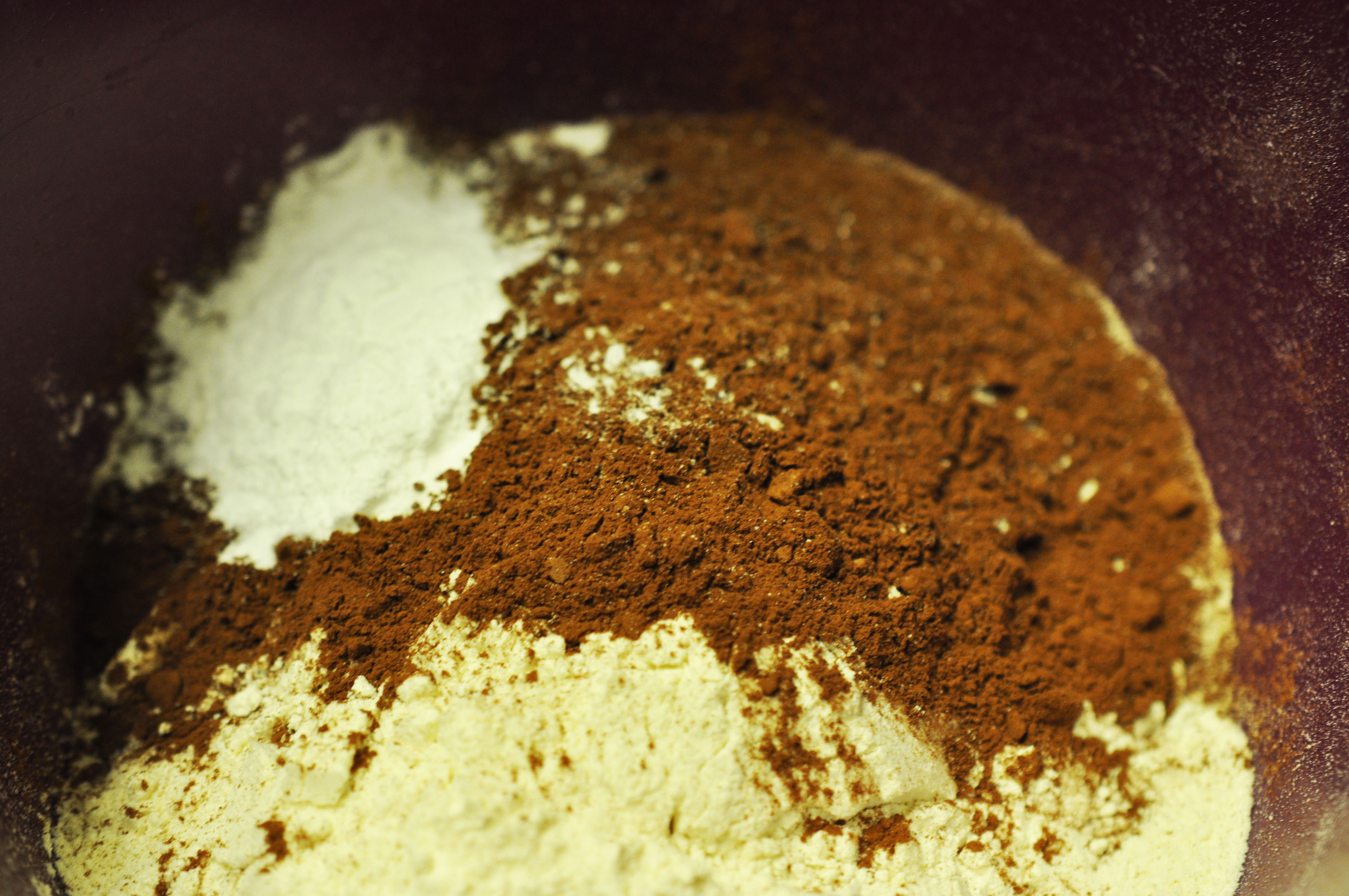 Blanda vetemjöl, kakao, bakpulver och salt och vänd ner detta i smeten.