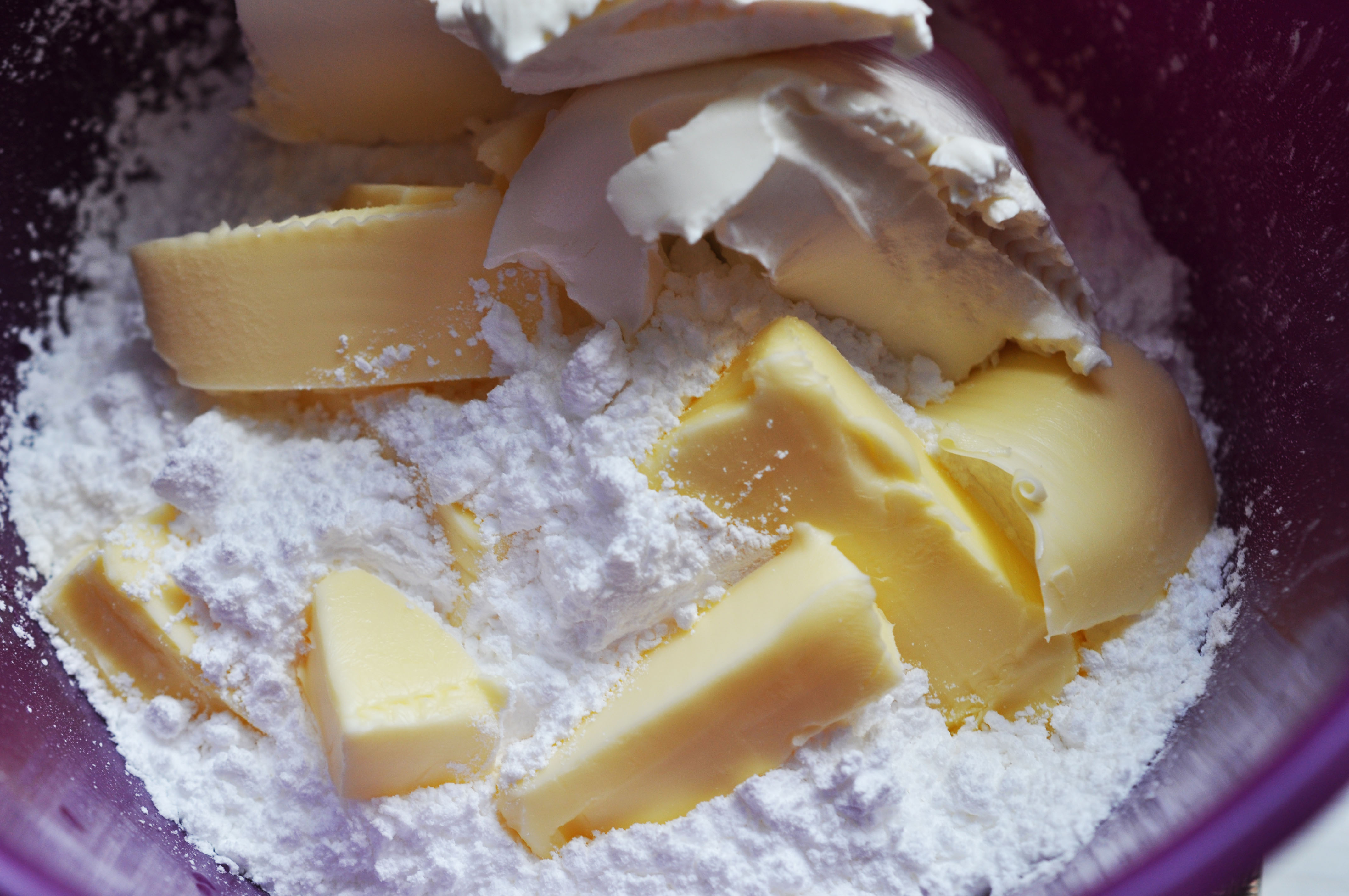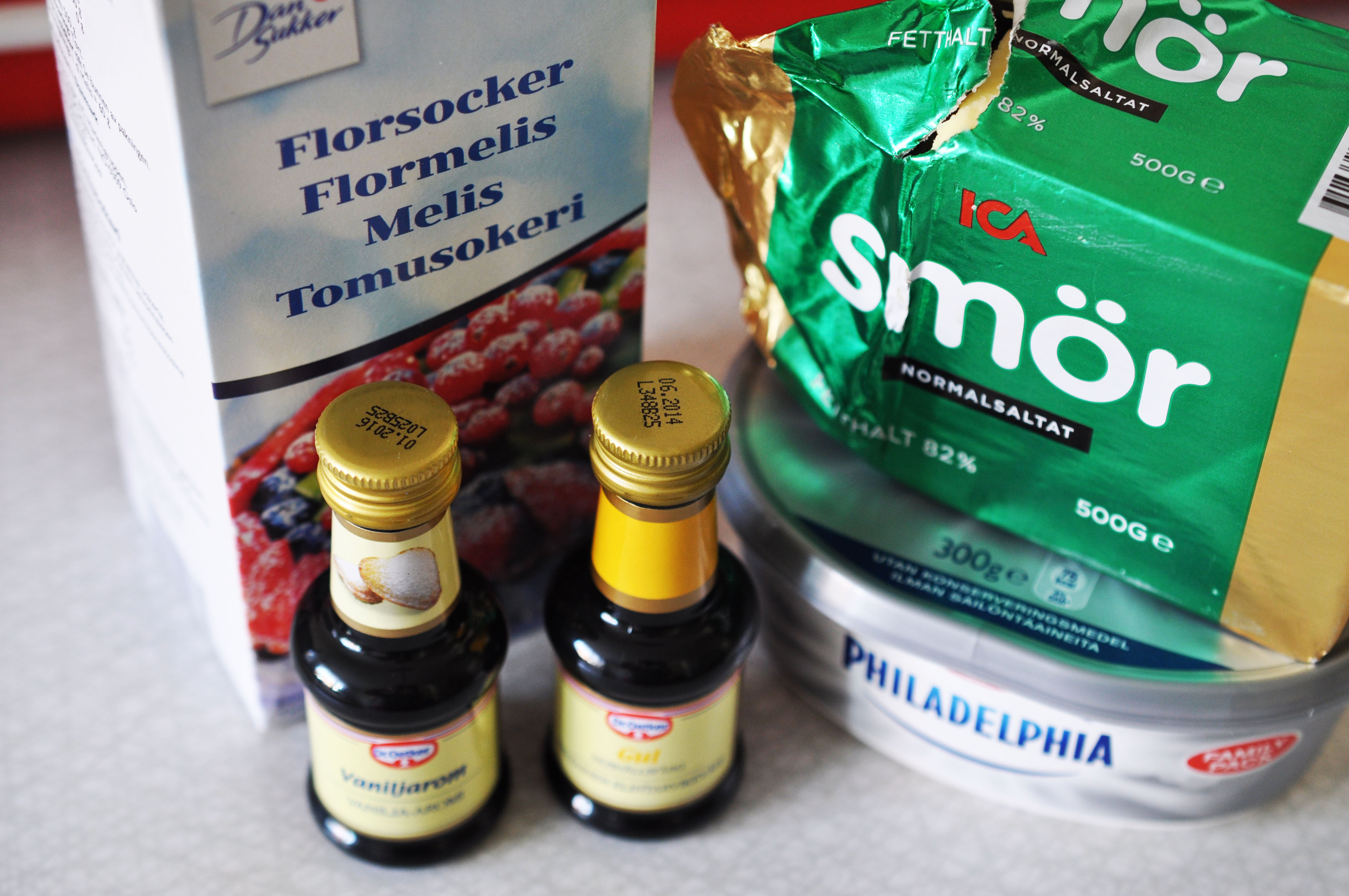 Vispa smör, florsocker och philadelphiaost krämigt i ca 5 minuter.