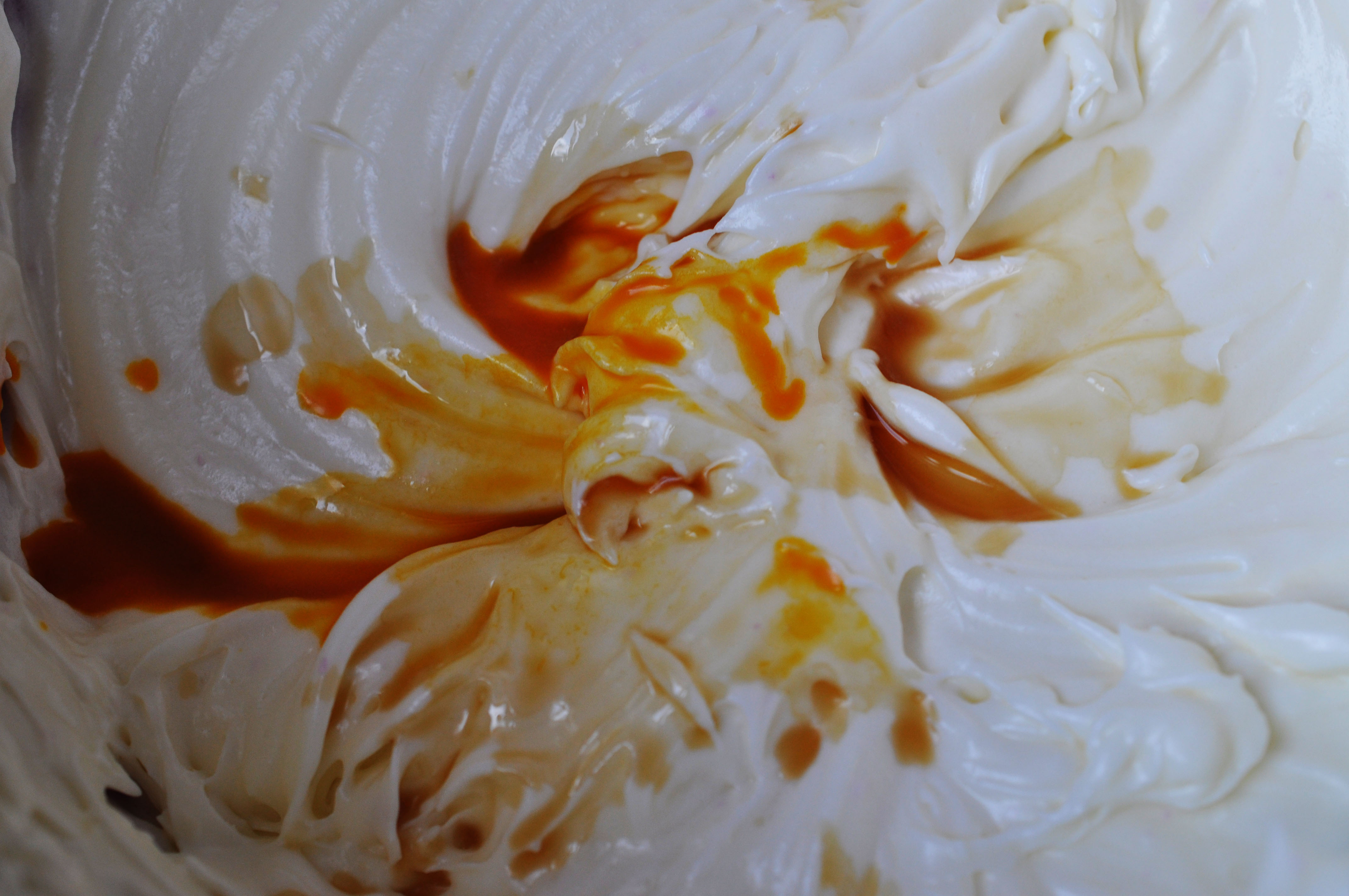 Häll i vaniljarom och gul karamellfärg efter tycke och smak.