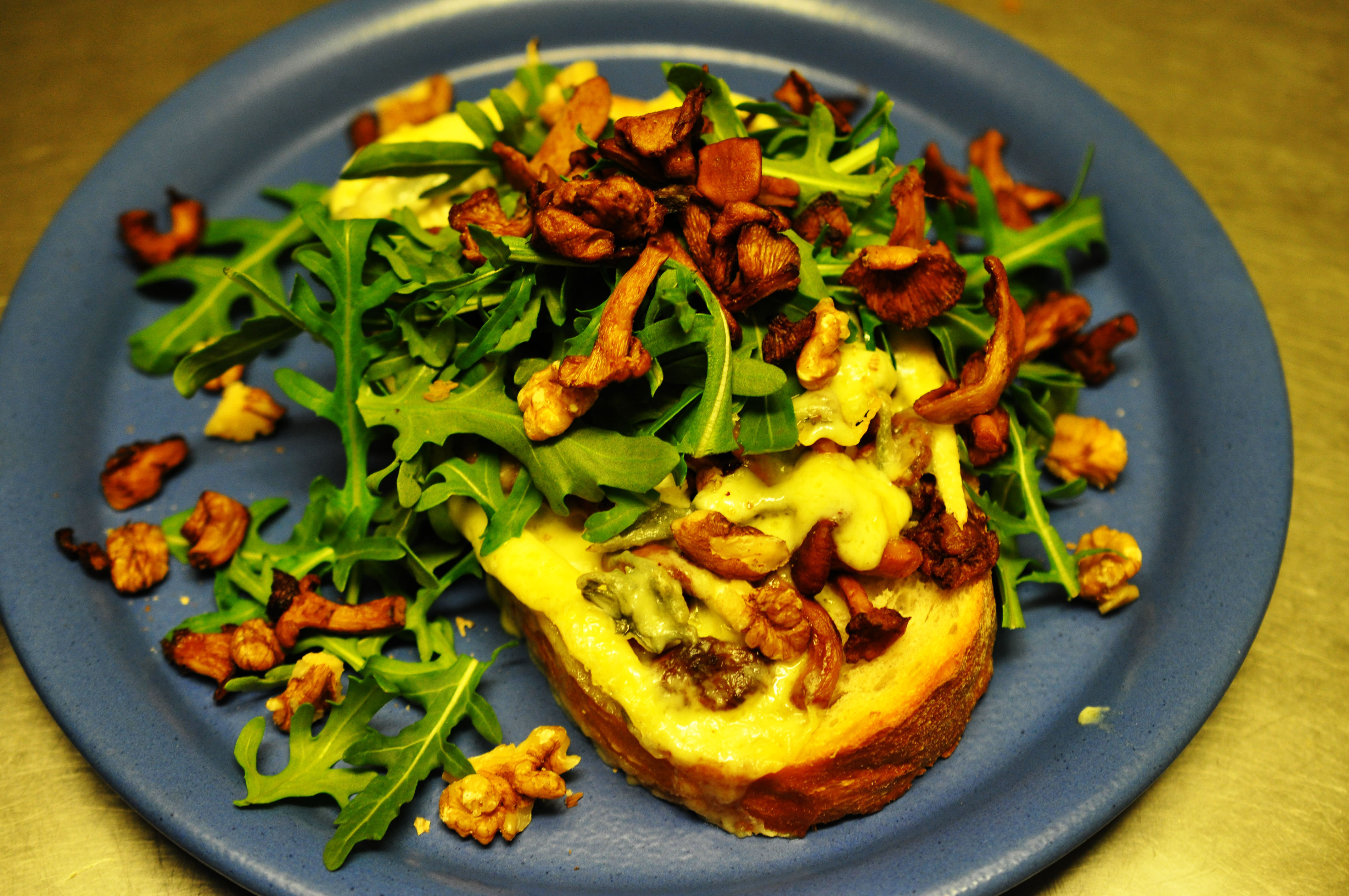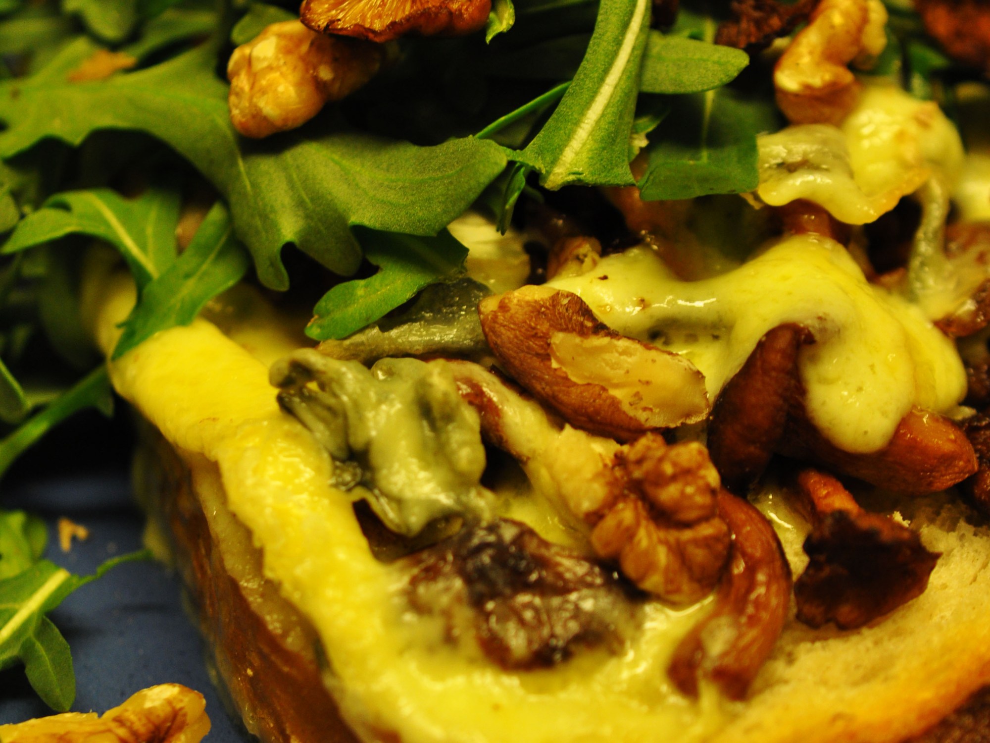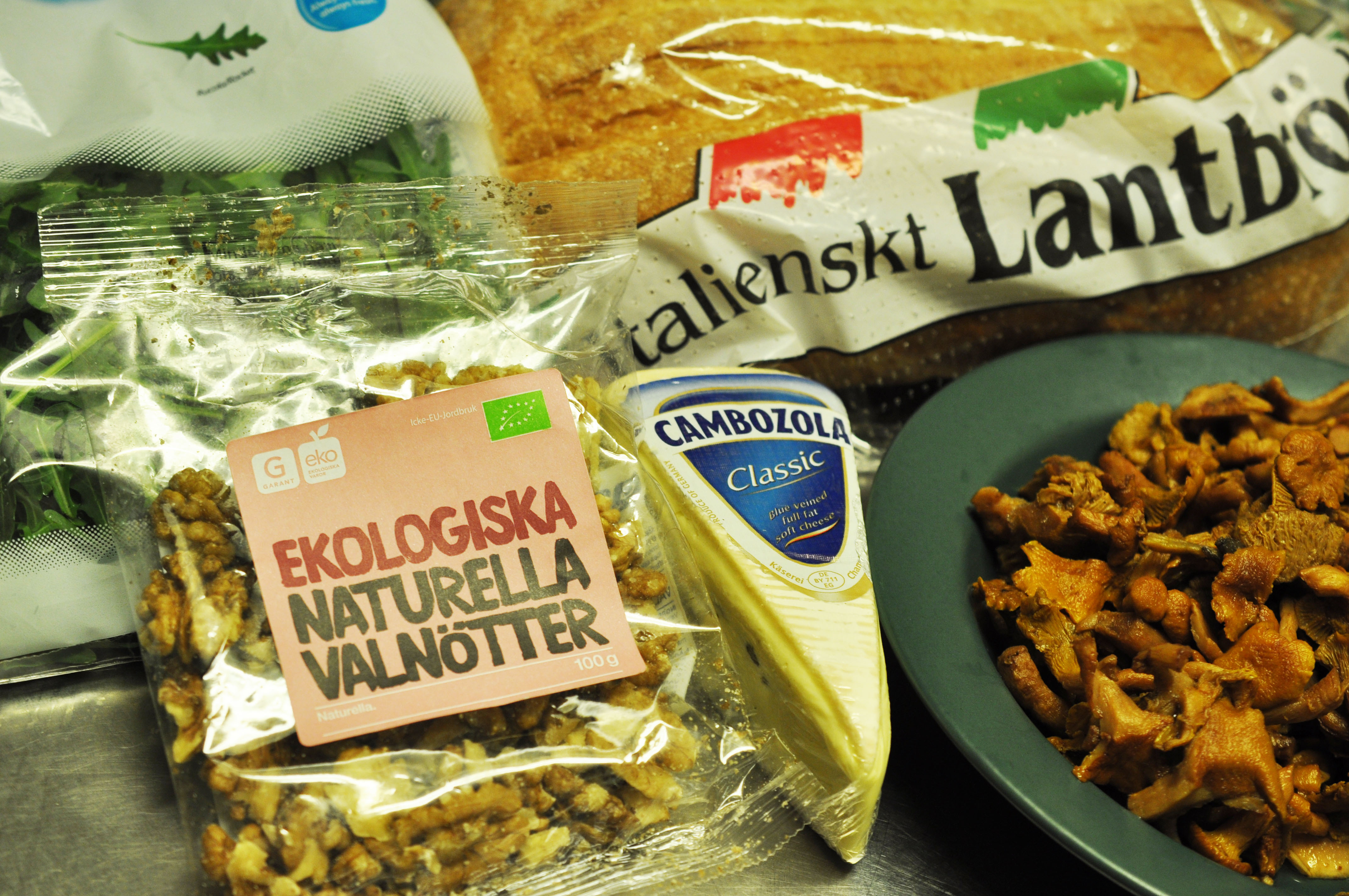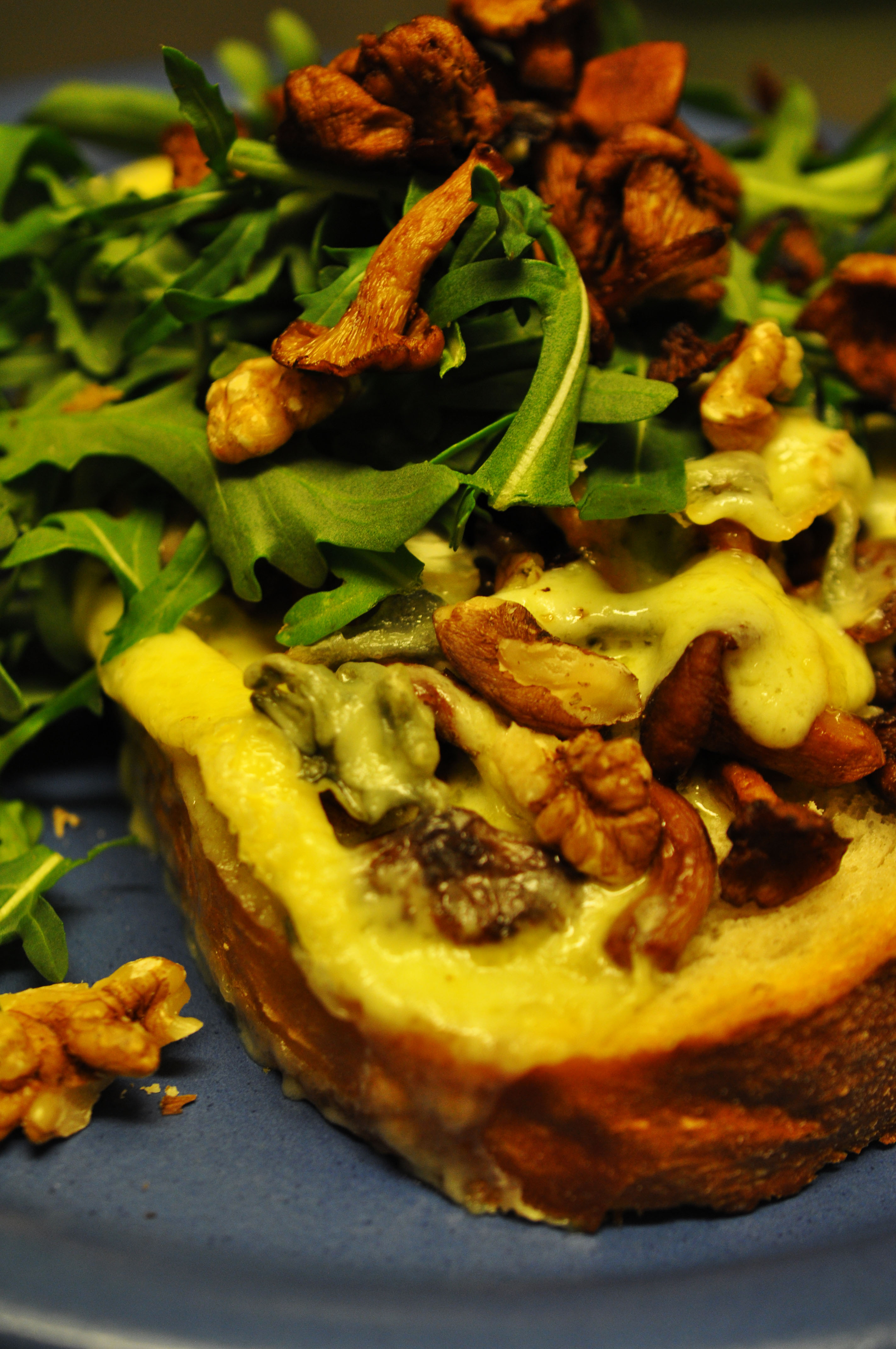 Toppa toasten med ruccola, valnötter och smörstekta kantareller.
