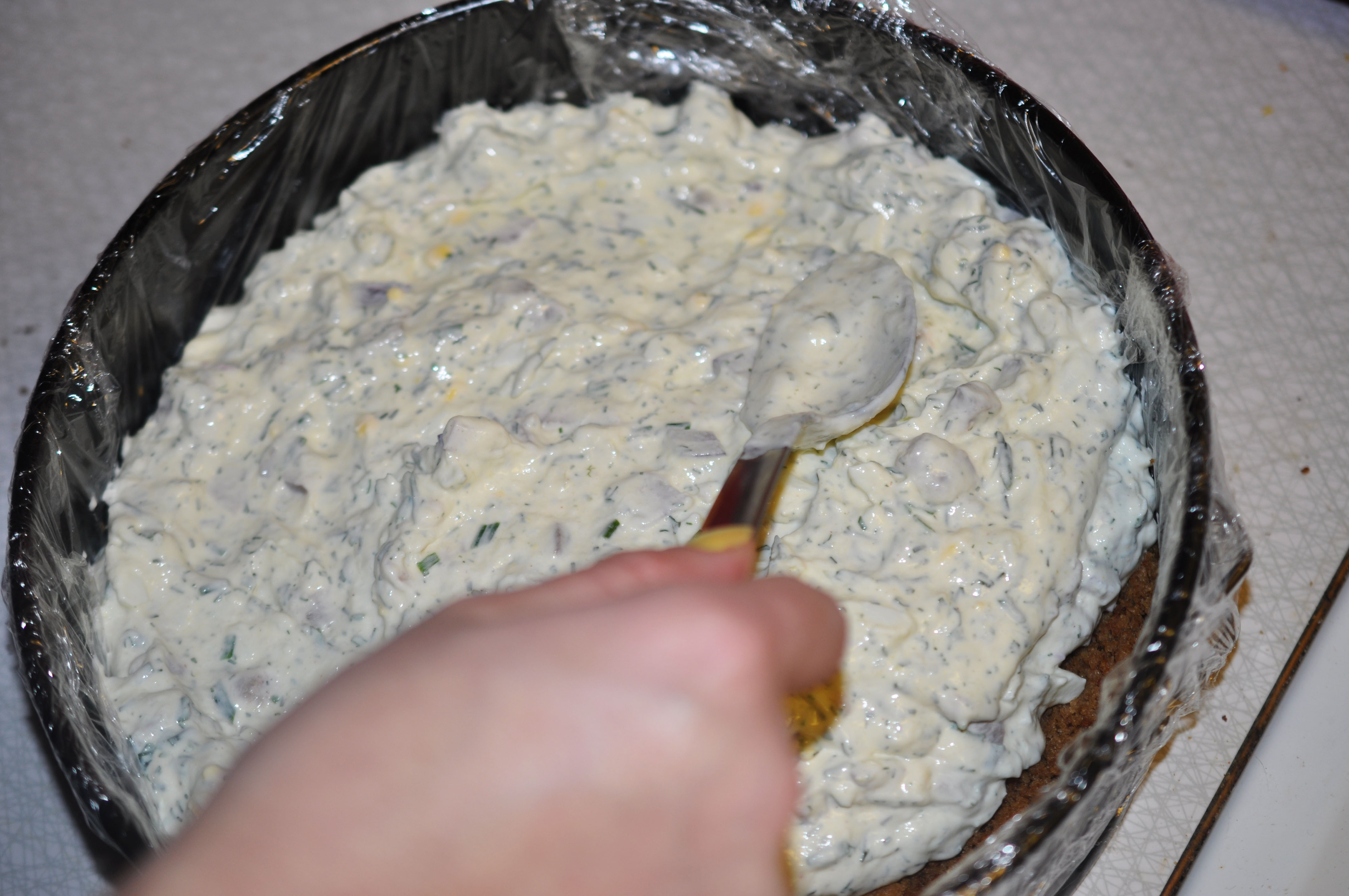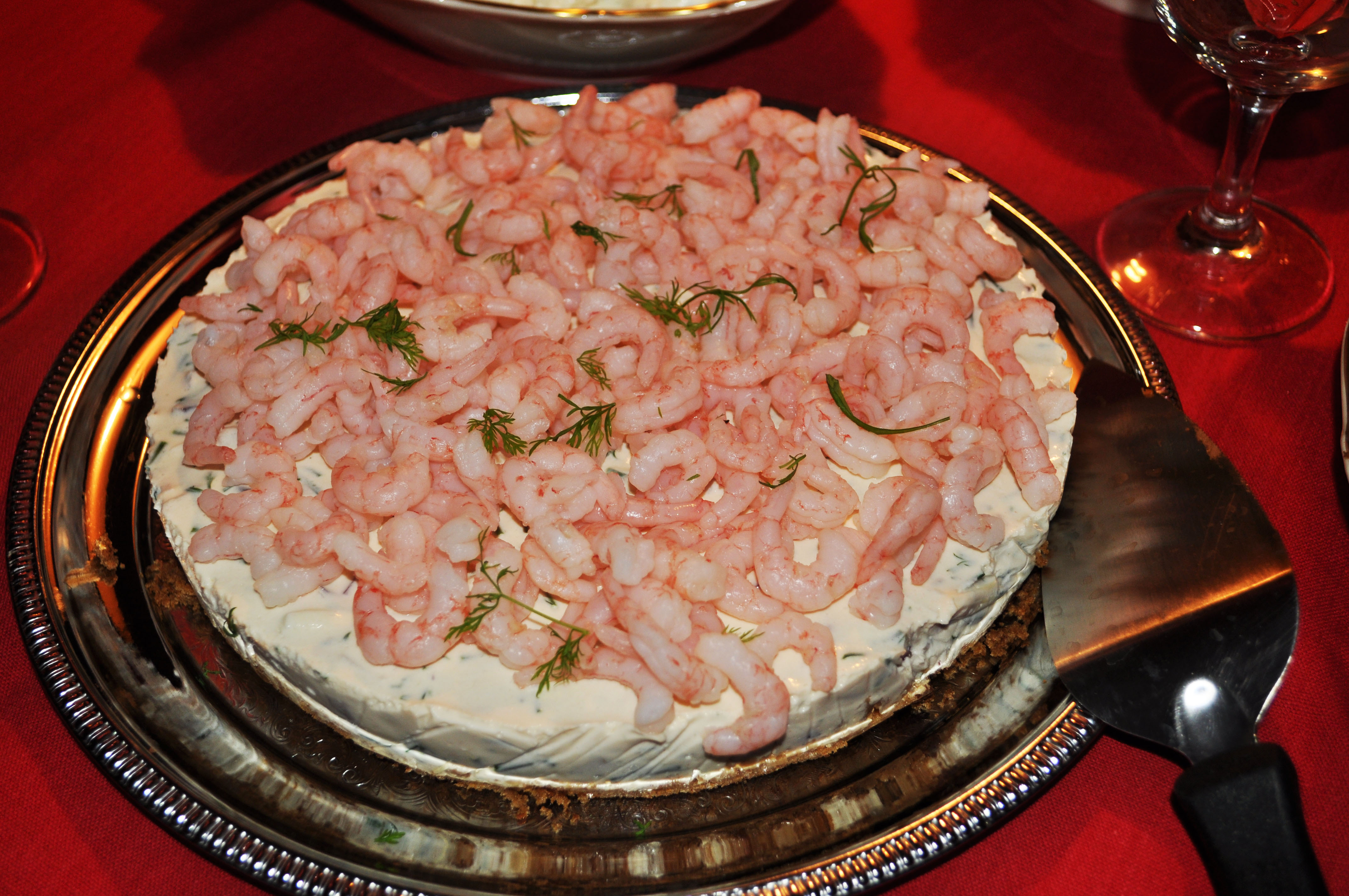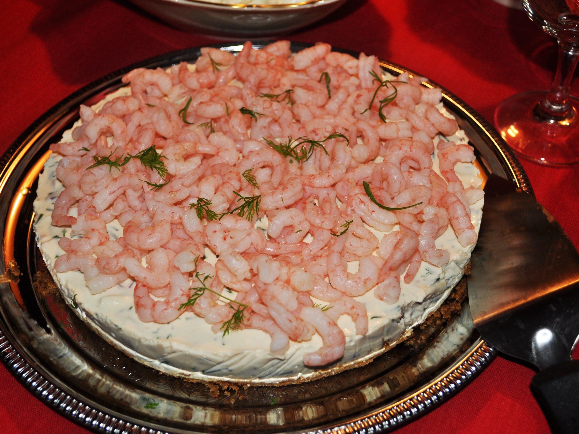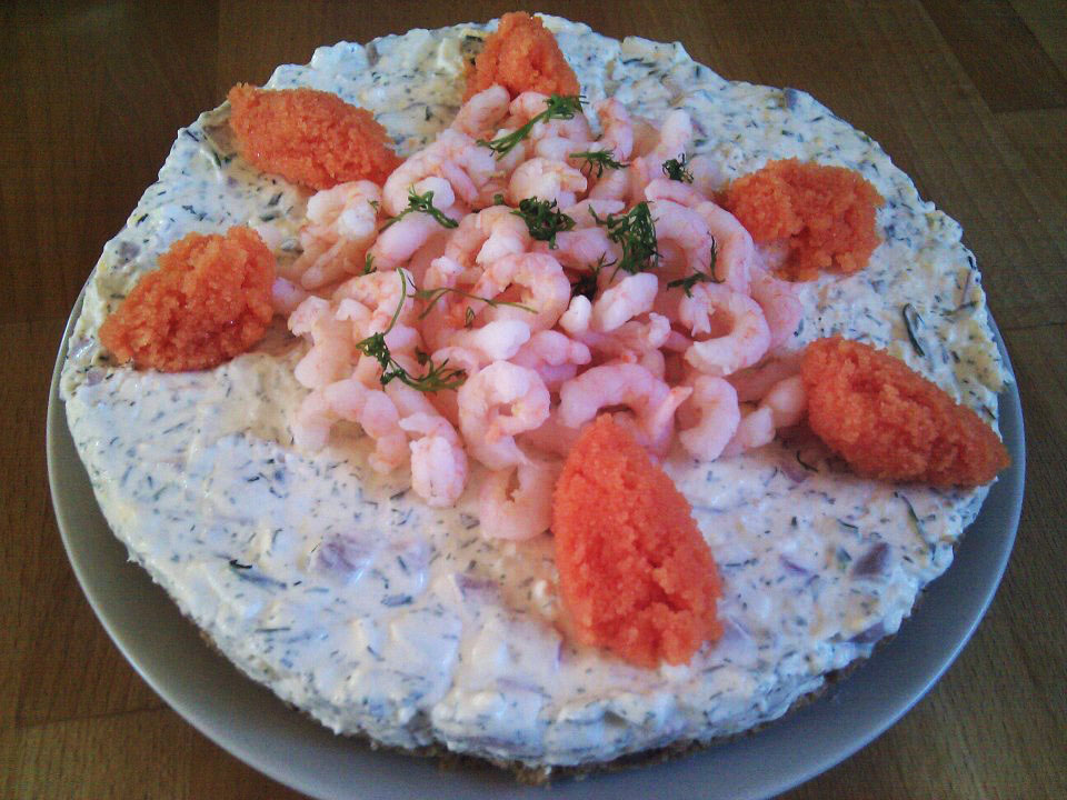 Garnera sedan tårtan hur du vill med räkor, dill och gräslök.