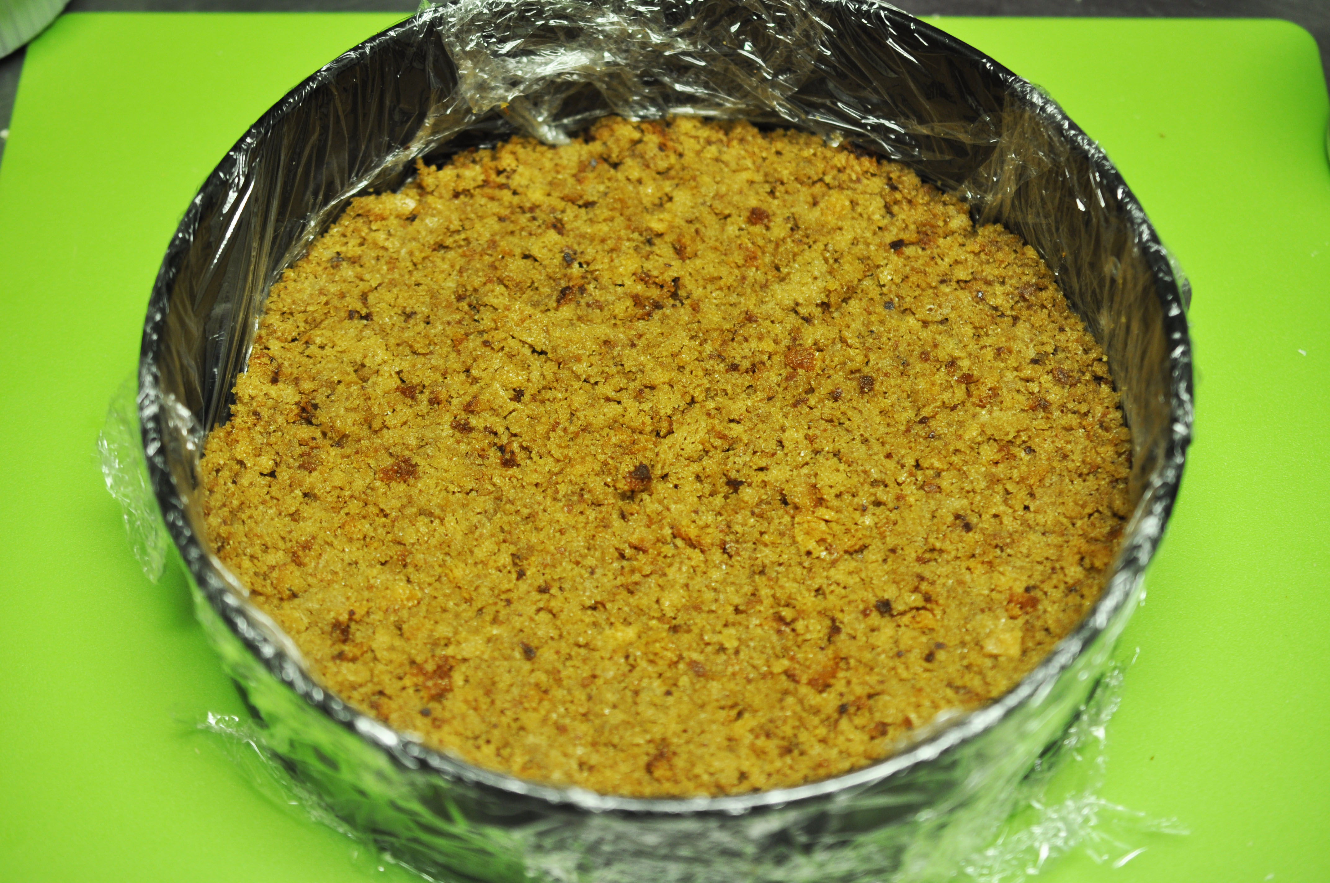 Mixa kavringen smulig. Smält smöret och blanda ner. Klä en springform med plastfolie och fördela brödblandningen i botten av formen och tryck till. Ställ in i kyl.