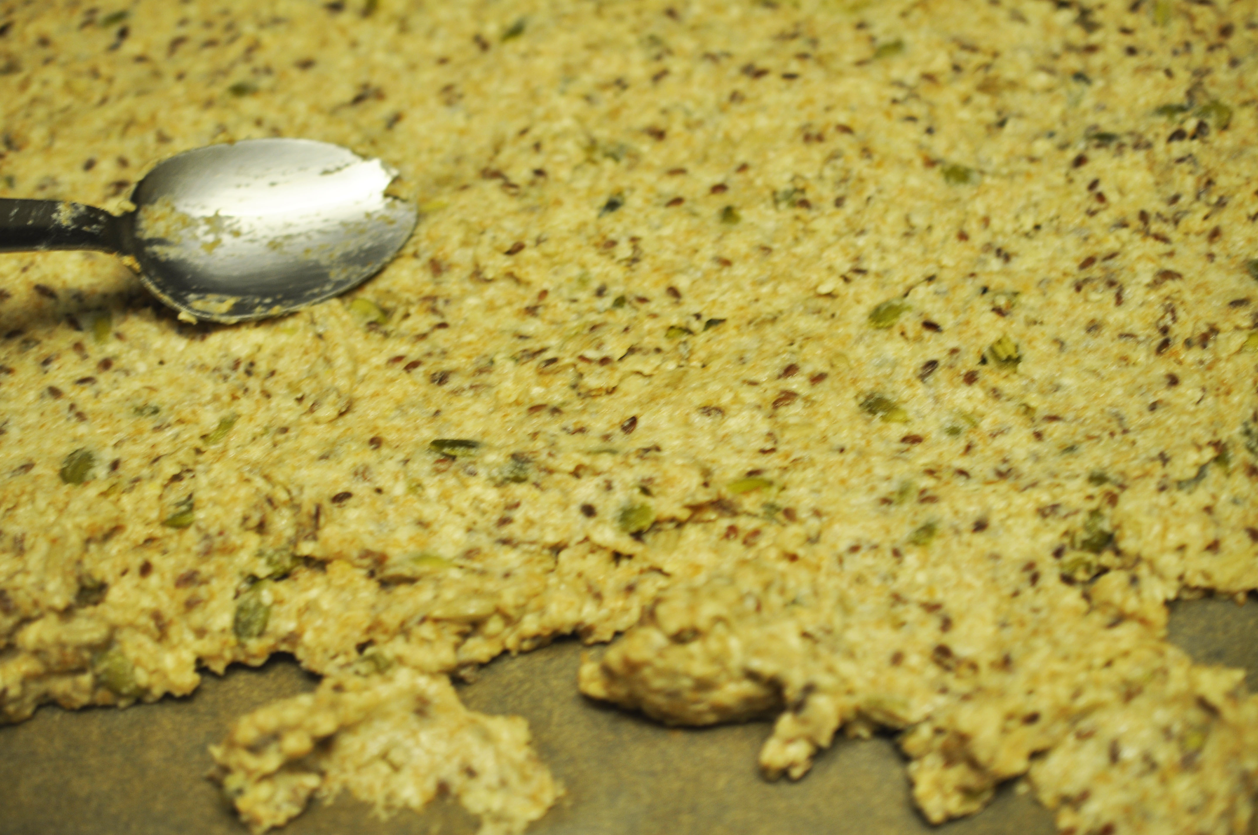 Bre ut allt på en bakplåtspapper på en plåt. Detta kan va lite klurigt eftersom smeten är så kladdig. Jag brukar använda mig av en sked eller så trycker jag med ett bakplåtspapper så det blir tunt. Ju tunnare desto knaprigare!