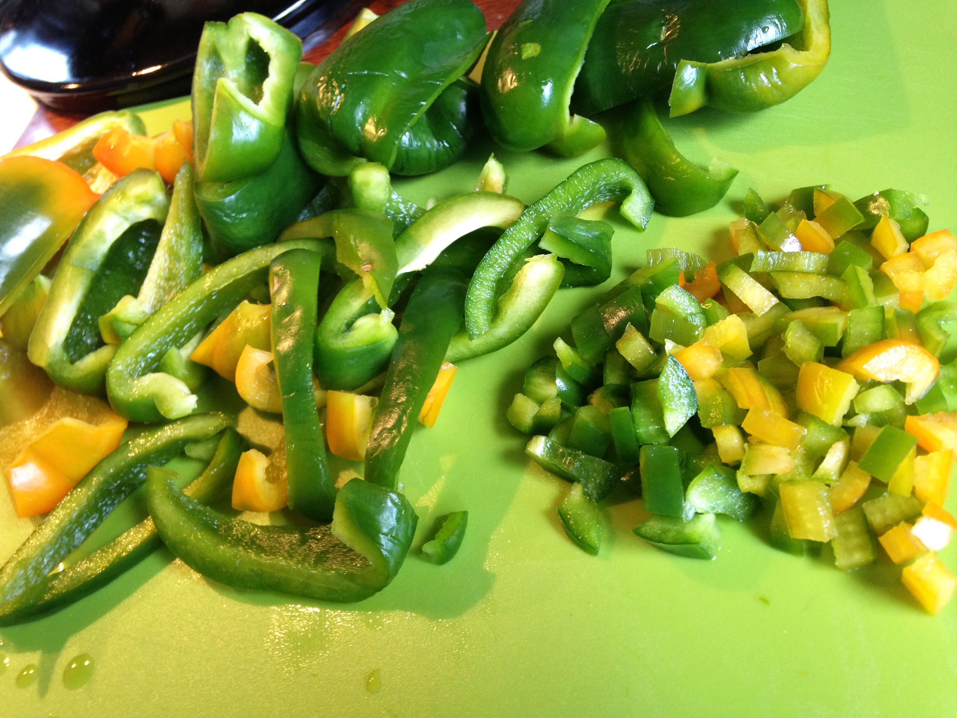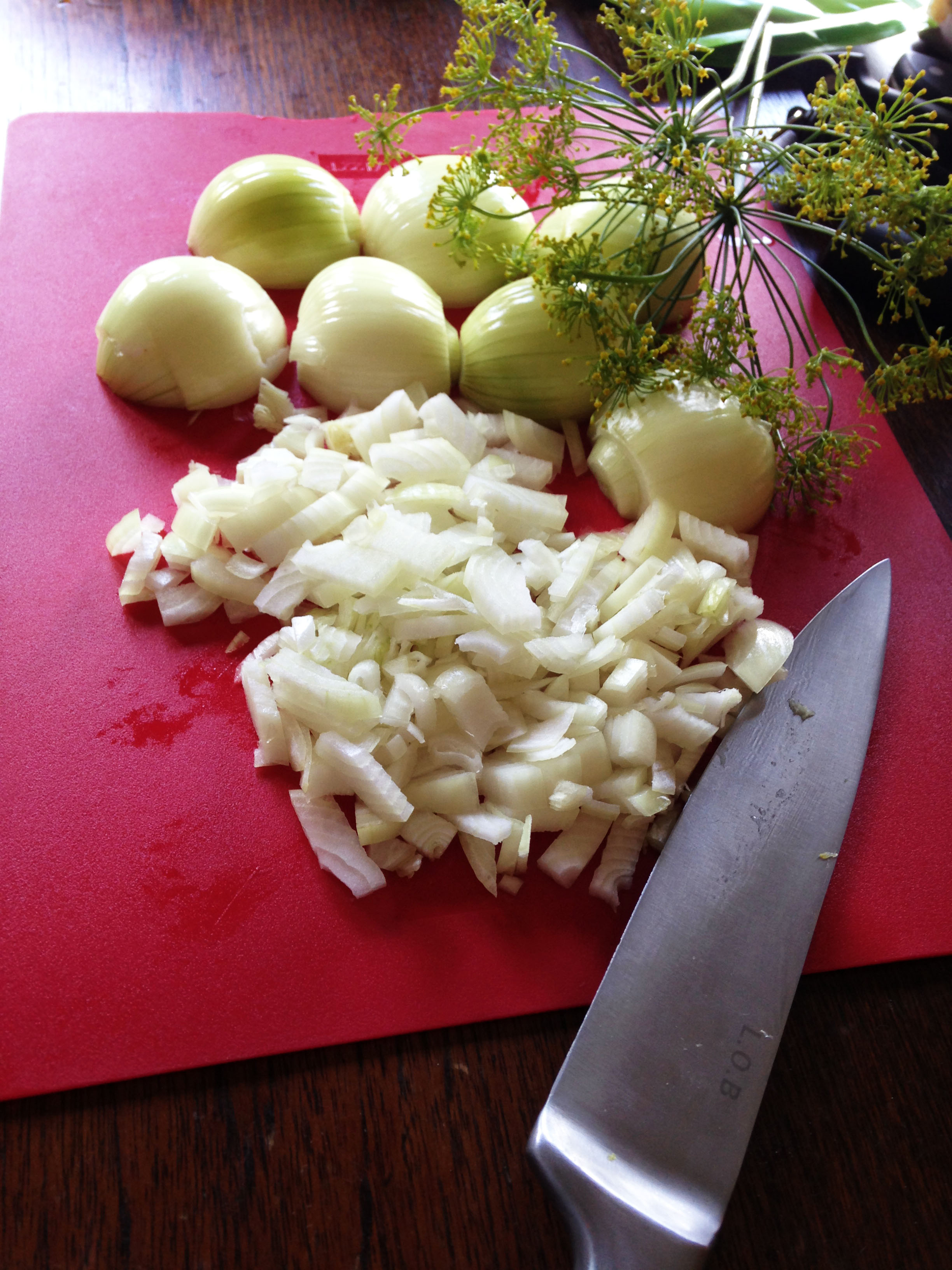 3. Skölj dillkronor, lök och paprika. Hacka lök och paprika.