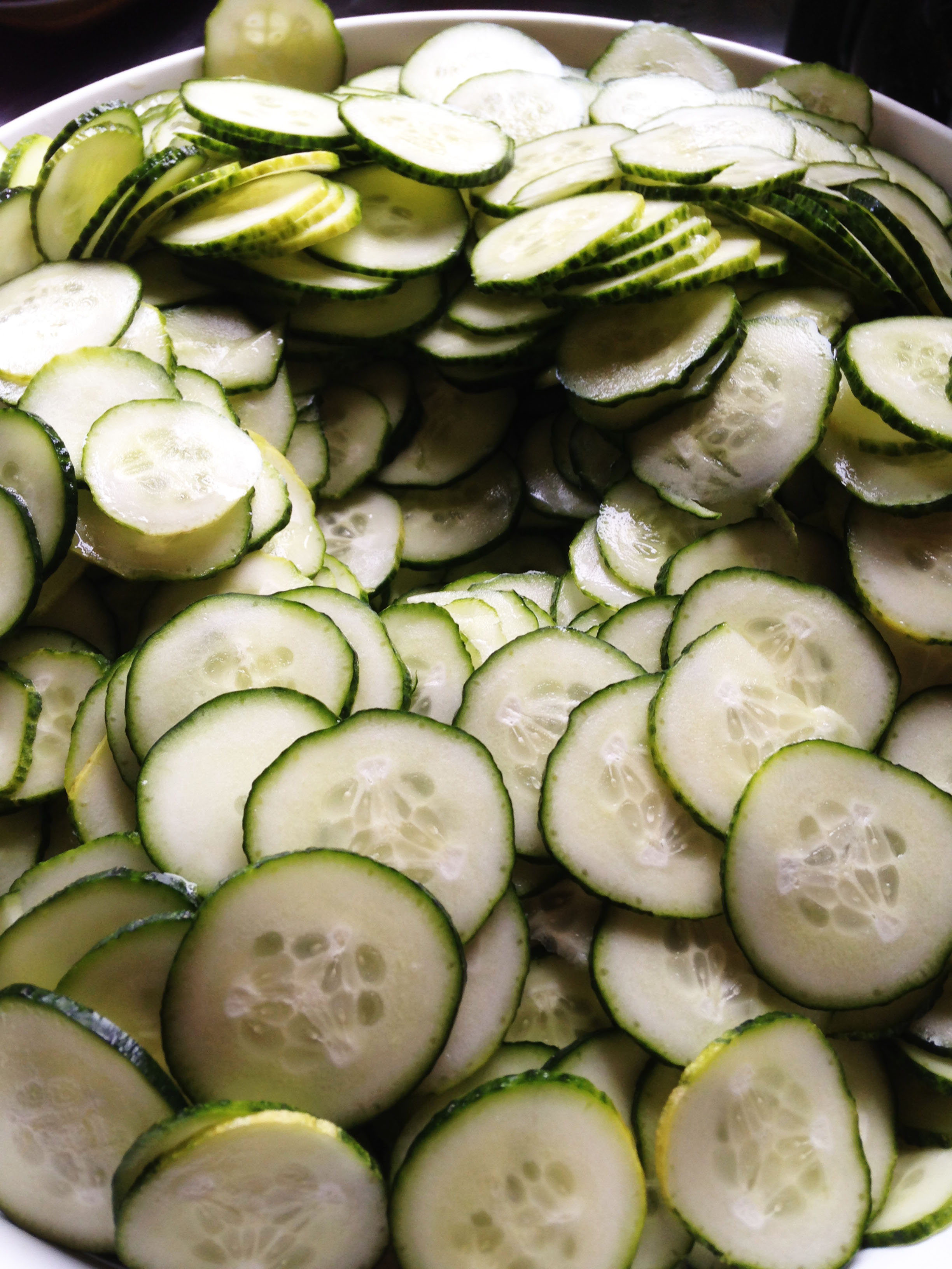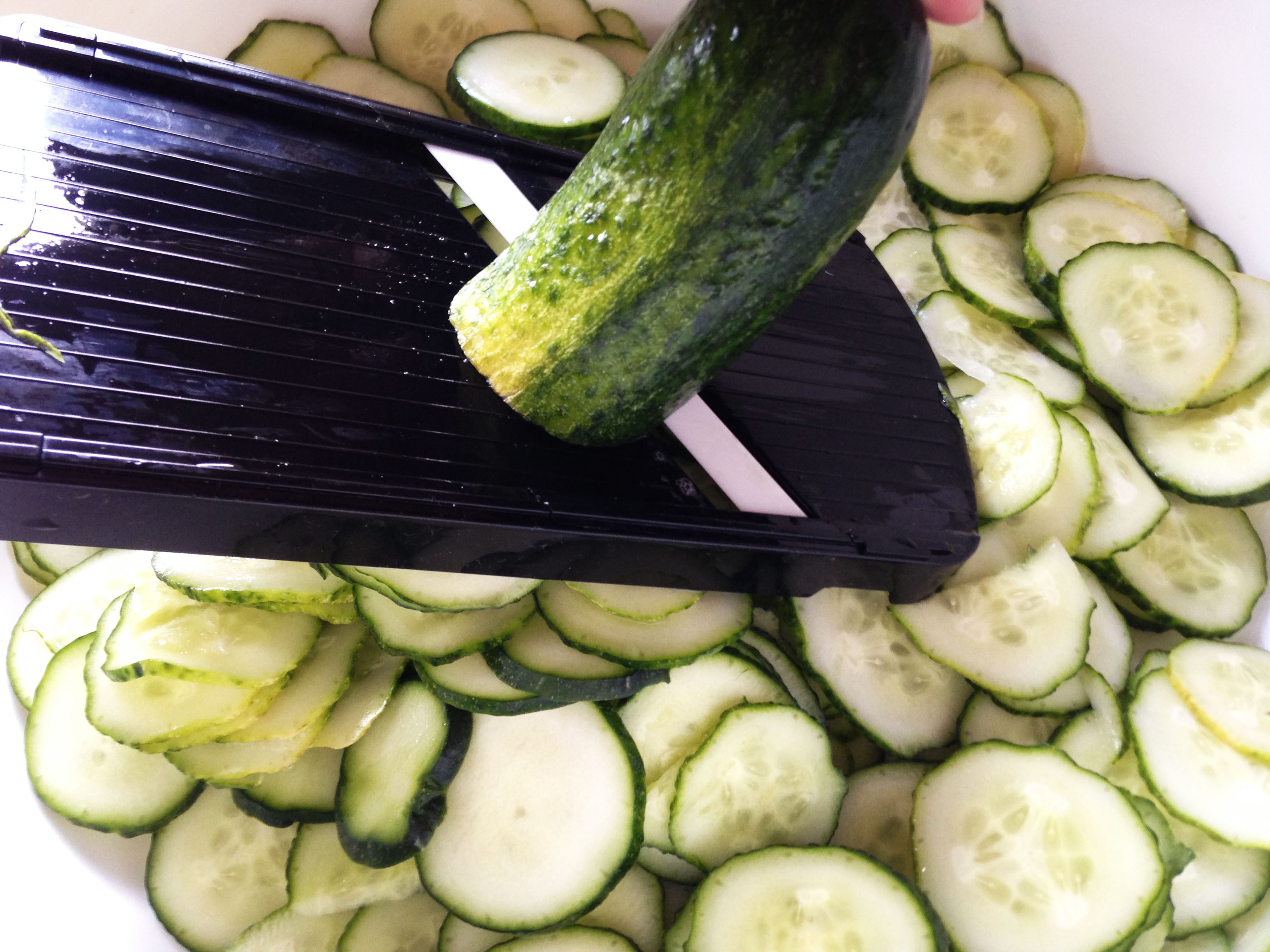 4. Skiva gurkan i en stor bunke. Ha gärna en mandolin till hjälp.