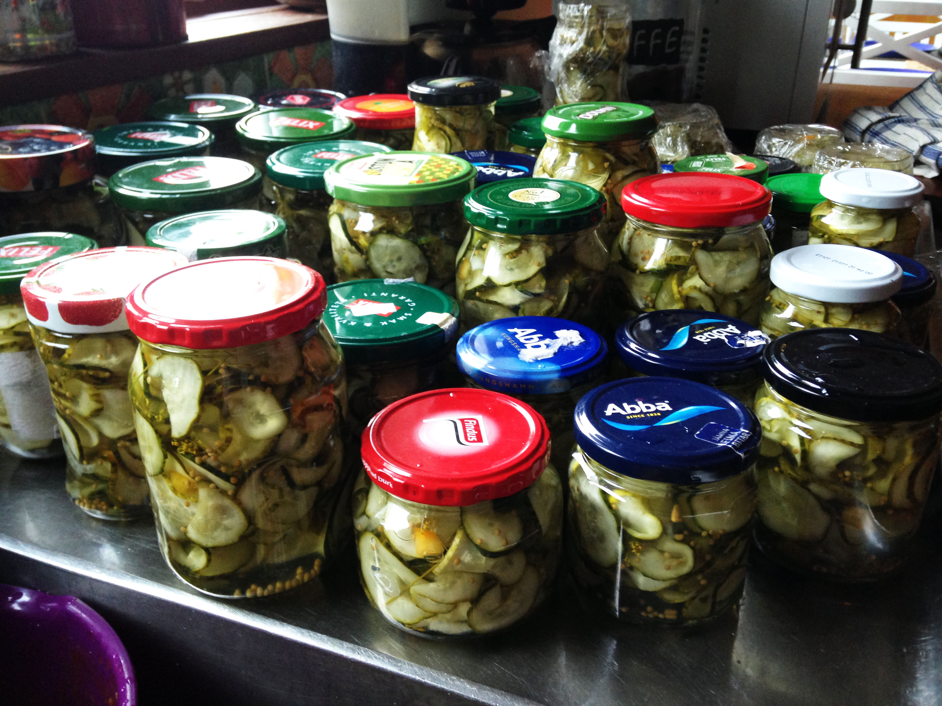 7. Efter en stund kommer gurkan att se ut så här, då är det dags att hälla upp den i burkarna. Ta bort lagerbladen, de är inte så goda att ha i burken.