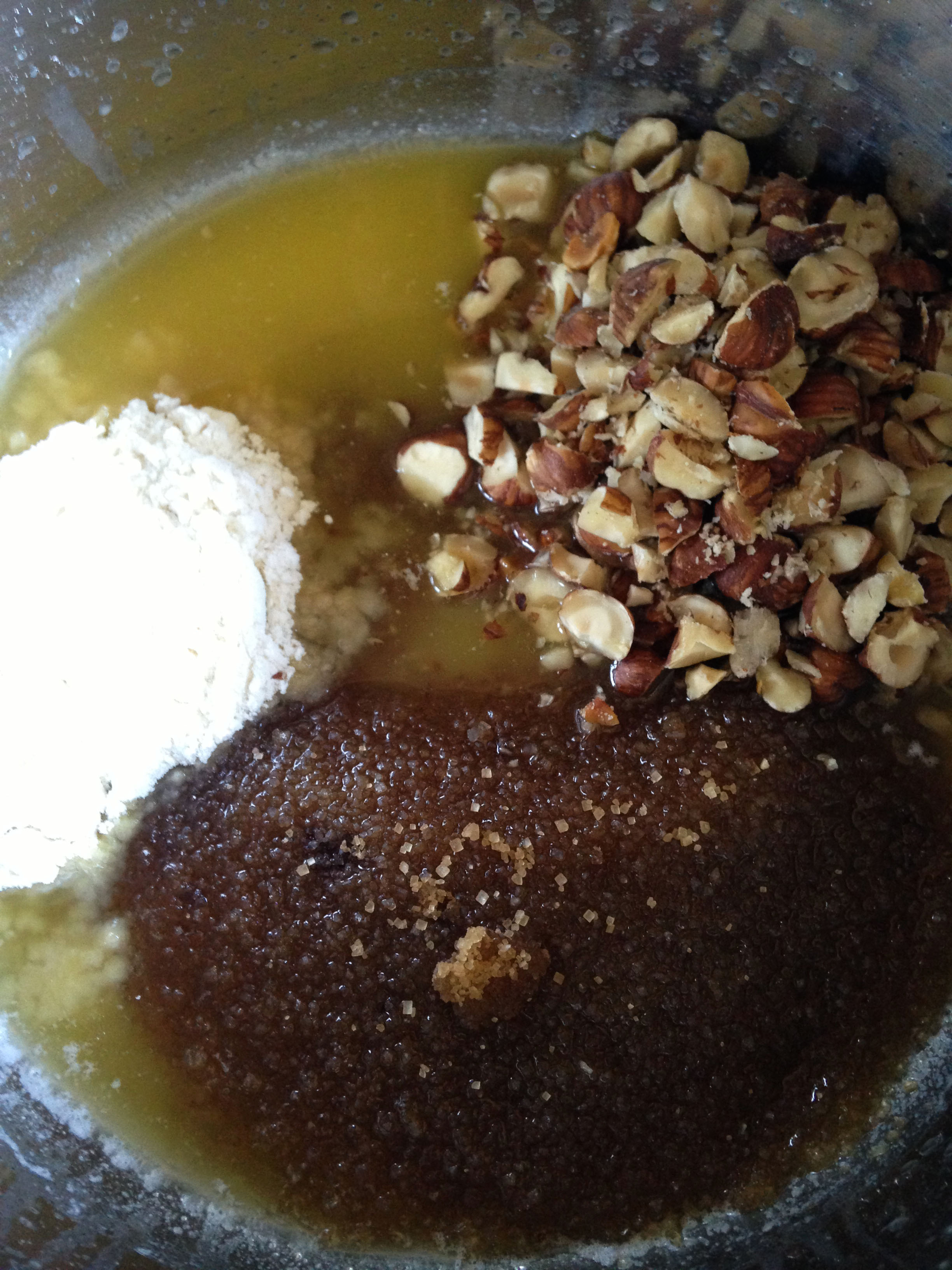 Smält smöret, tillsätt övriga ingredienser och rör till en smulig massa. Ställ in i kylen.