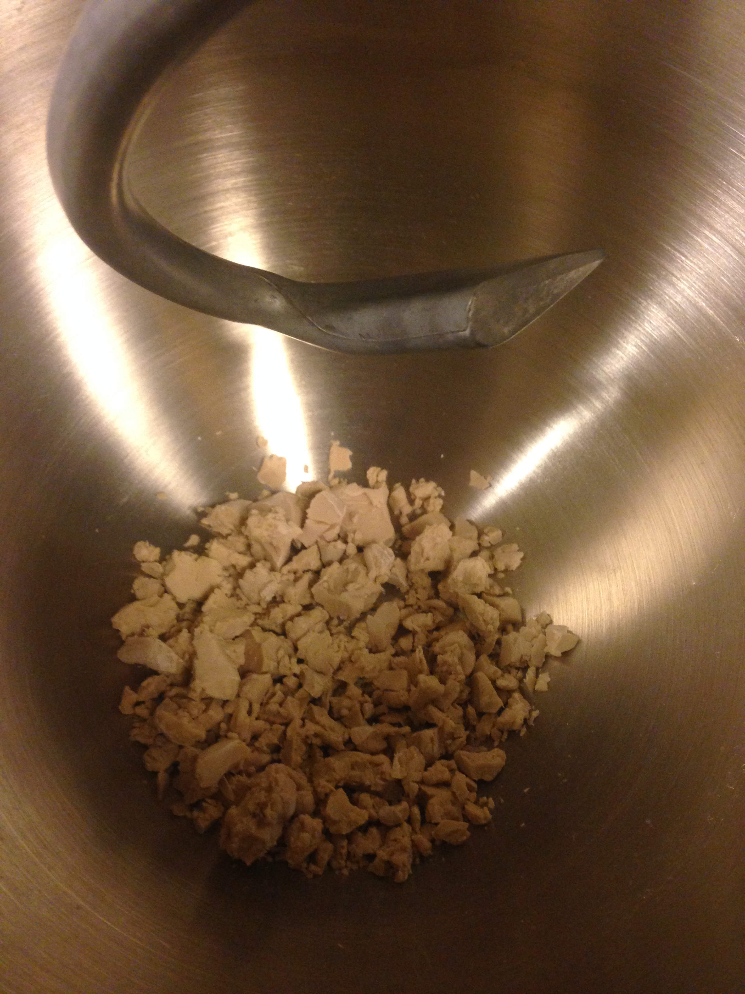 2. Smula i jästen i degbunken och häll på vätskan. Rör om så jästen löses upp.
