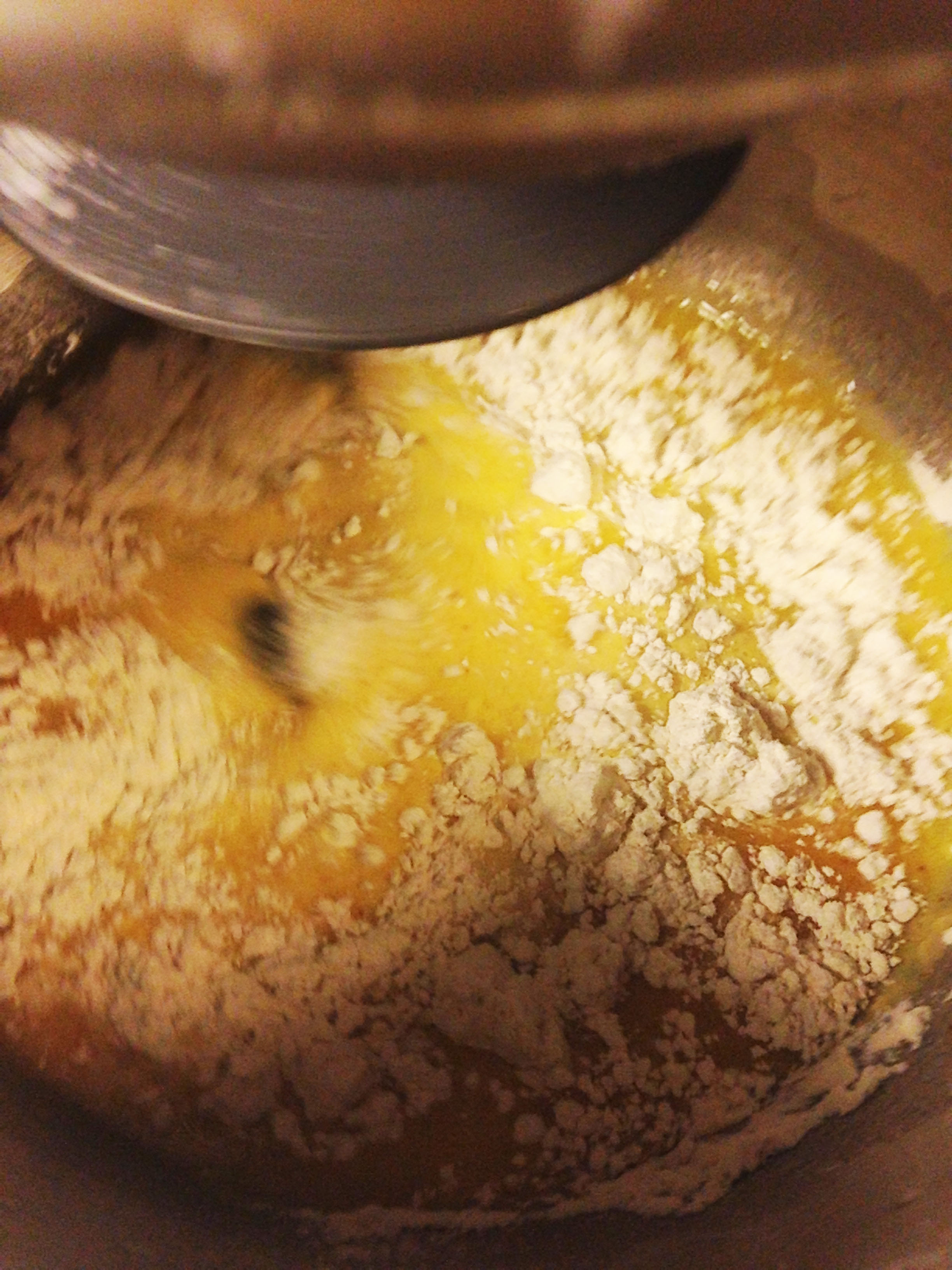 3. Häll i mjölet, lite i taget. Lite av mjölet ska sparas att bakas ut med. Du känner när degen är klar genom att när du tar i degen så ska den va lite klibbig, men inte fastna på dina fingrar.