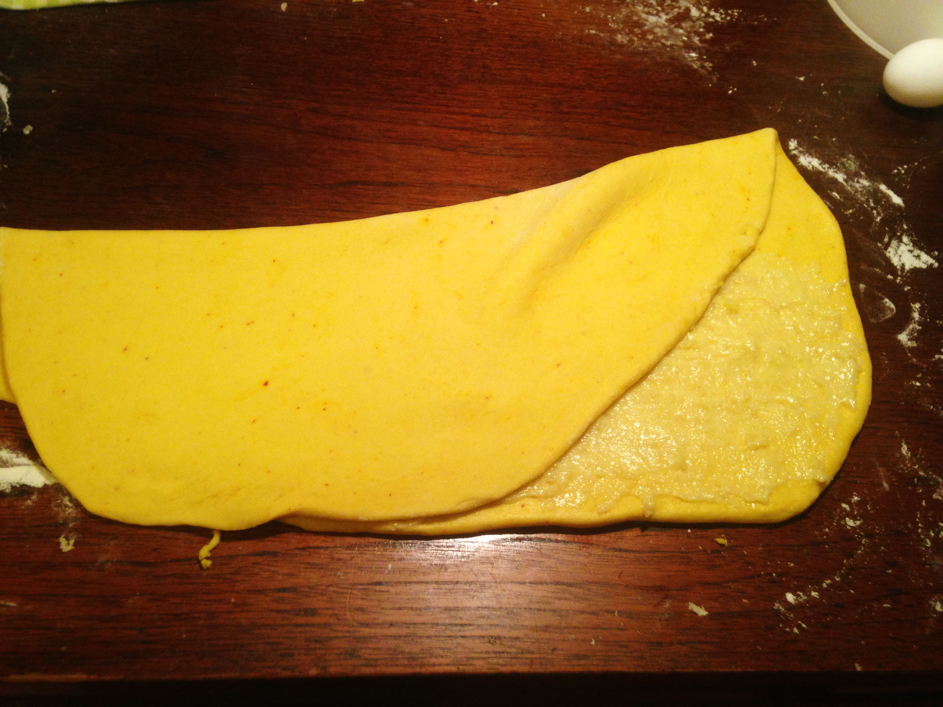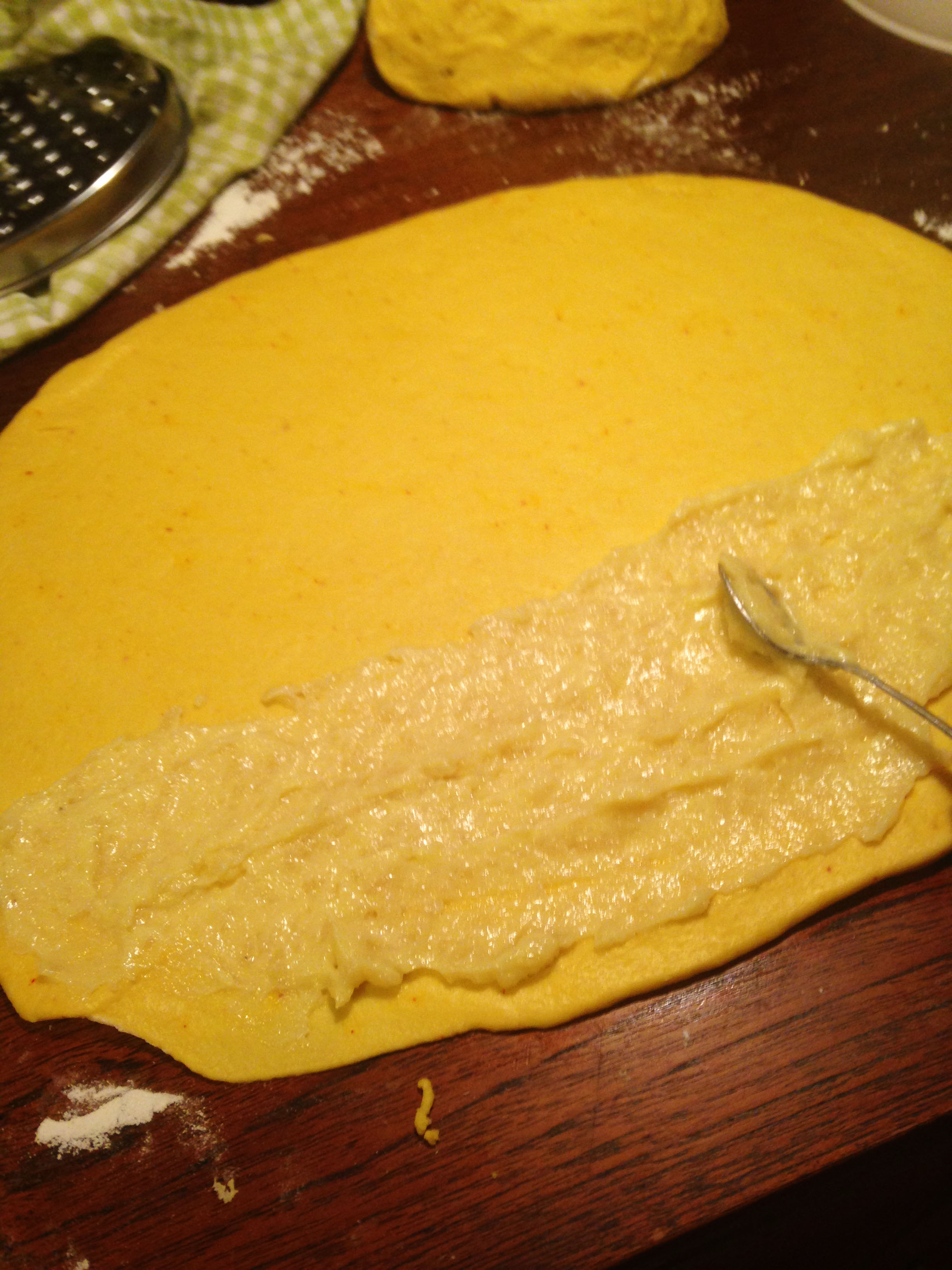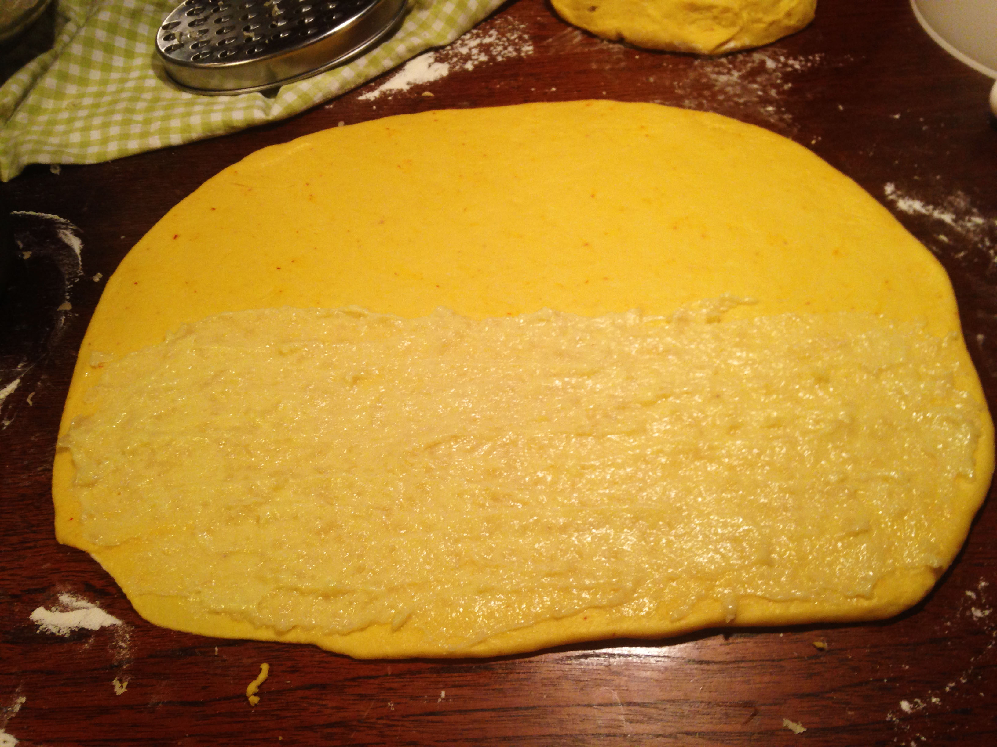 8. Bre på fyllningen på halva degen. Lägg deghalvorna på varandra.