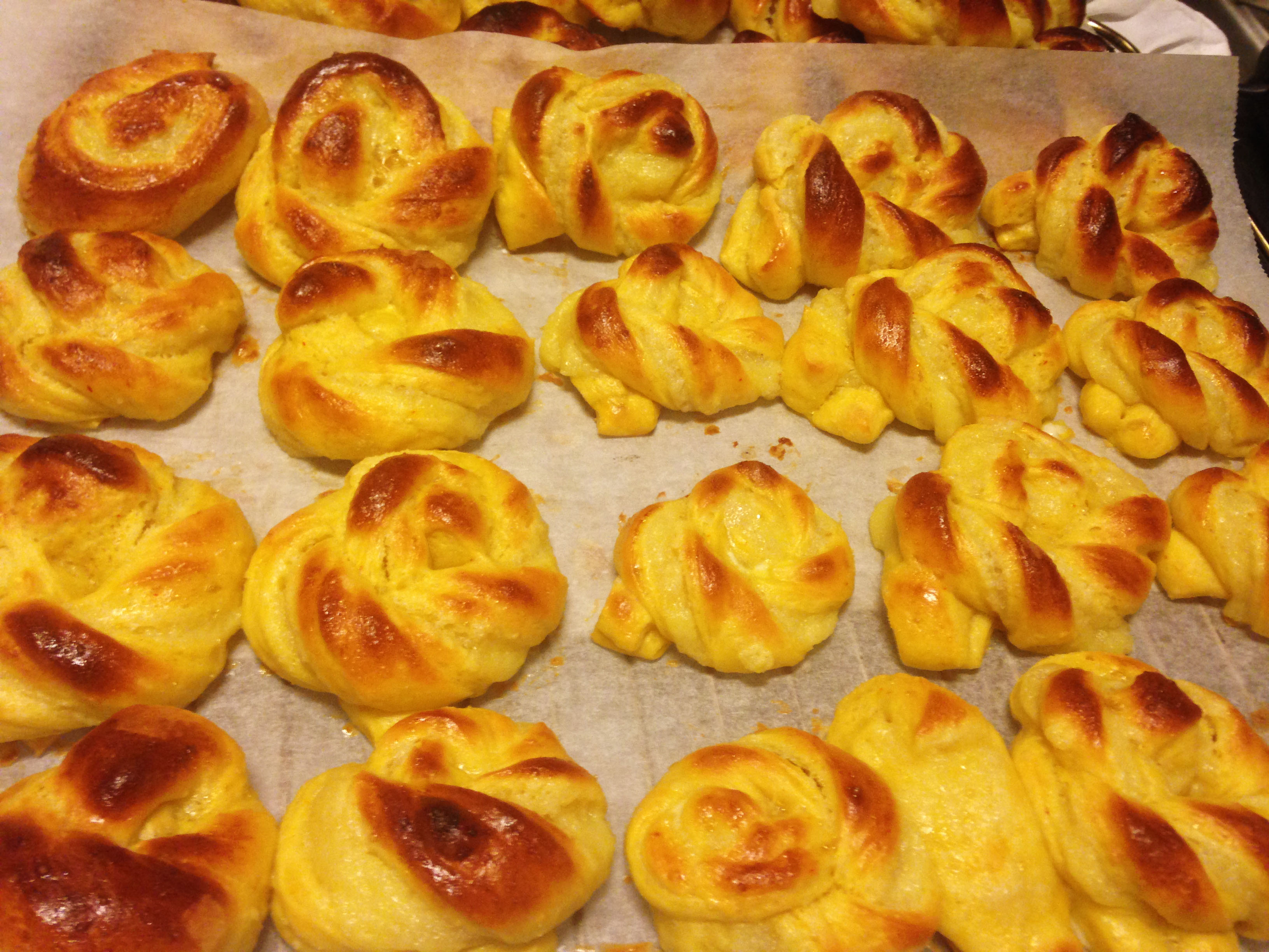 Detta receptet på saffransbullar kommer ifrån min mamma. Det har vi gjort i alla år. Men denna gången gjorde jag en liten tvist och hade vaniljkräm i. Brukar bara ha smör och mandelmassa som fyllning. Men dessa blev jättegoda! Ett år hade jag även riven vit choklad i som fyllning. Gott det med! Självklart kan man ha russin i degen eller som dekoration. Ett tips är att lägga russinen i lite vatten innan så blir dom lite saftigare.
