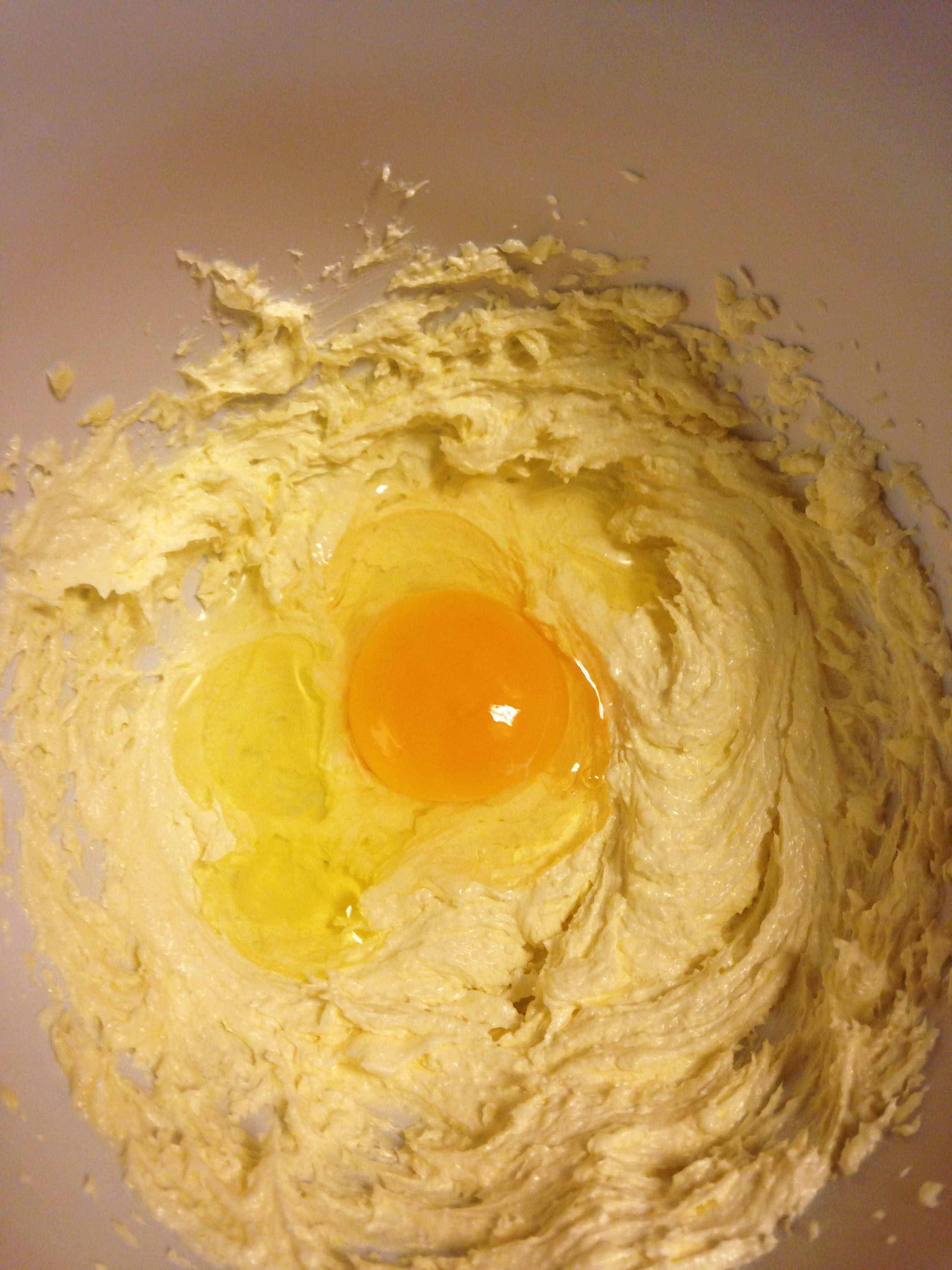2. Vispa smör och socker poröst. Vispa i ägget och äggulorna en i taget.