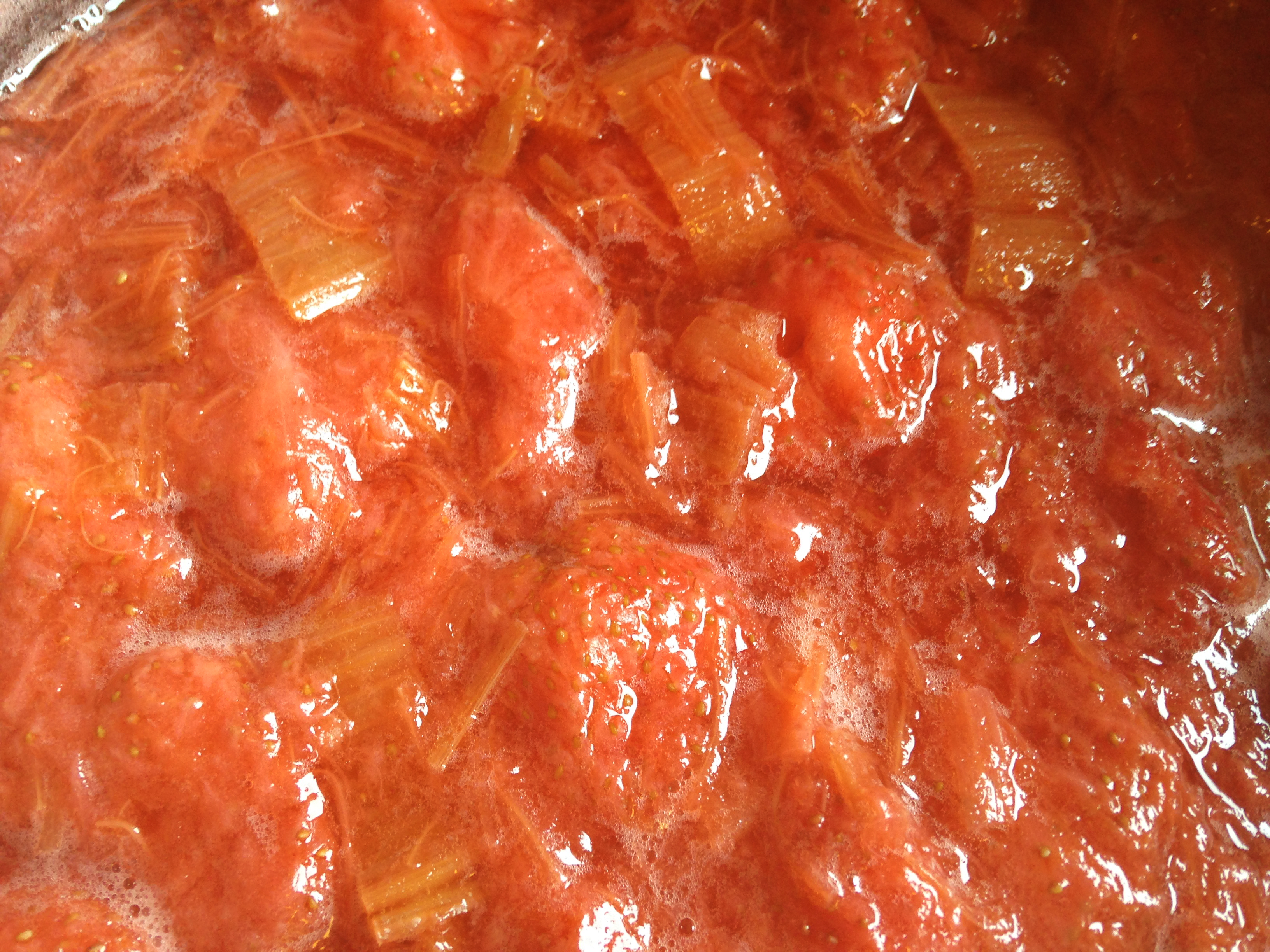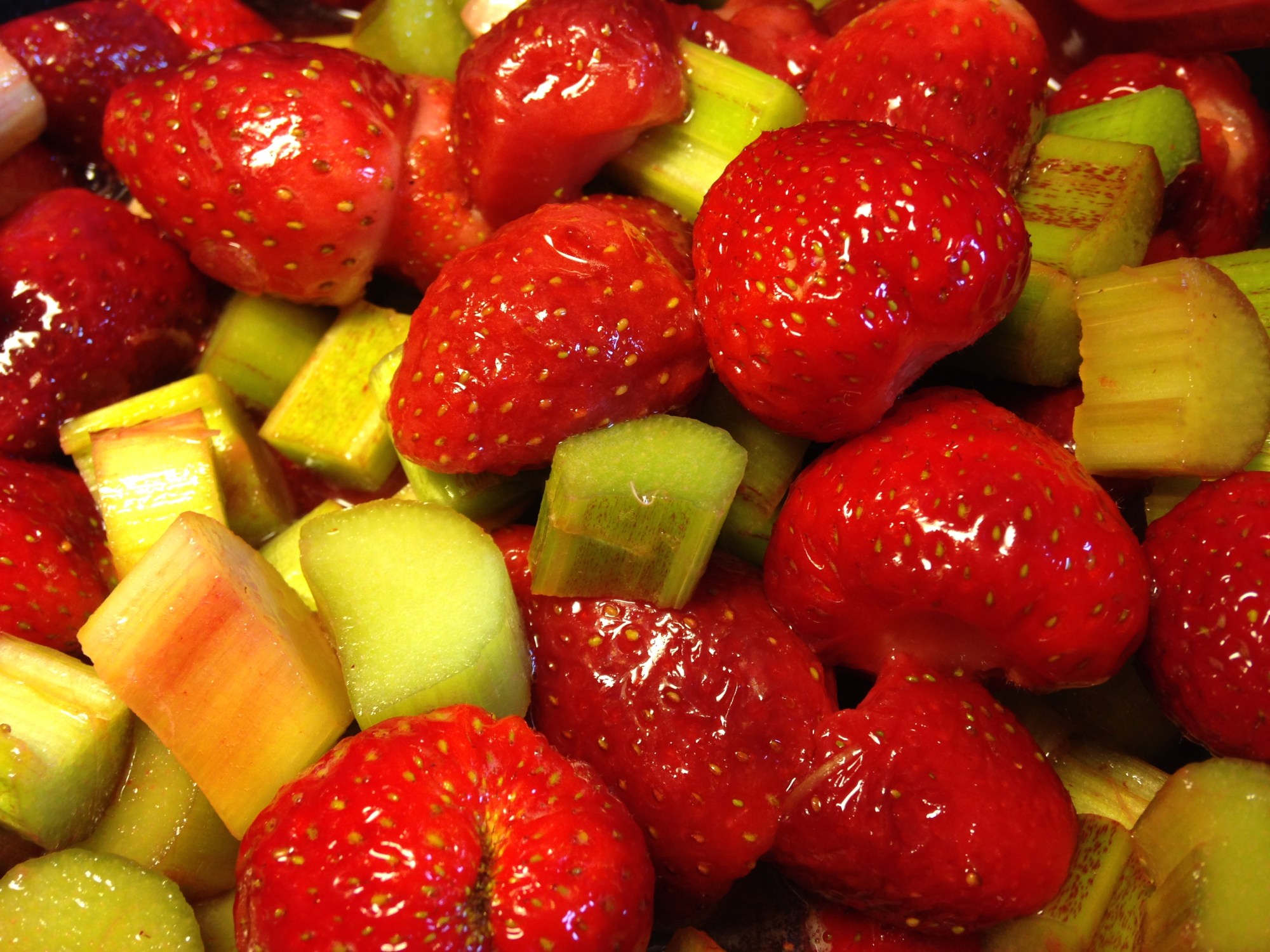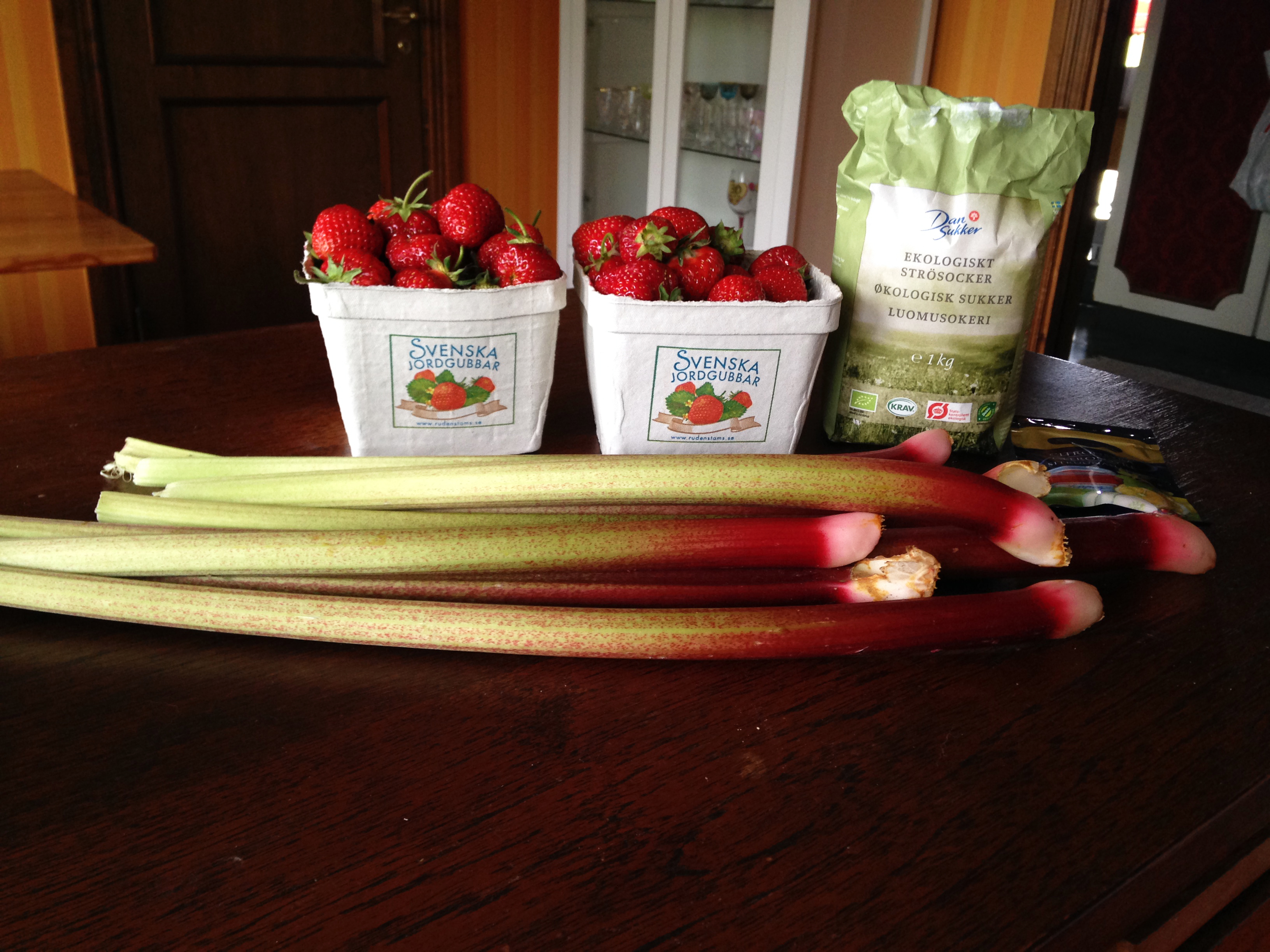 1. Rensa jordgubbarna. Skala och hacka rabarberna. Koka upp med vatten.