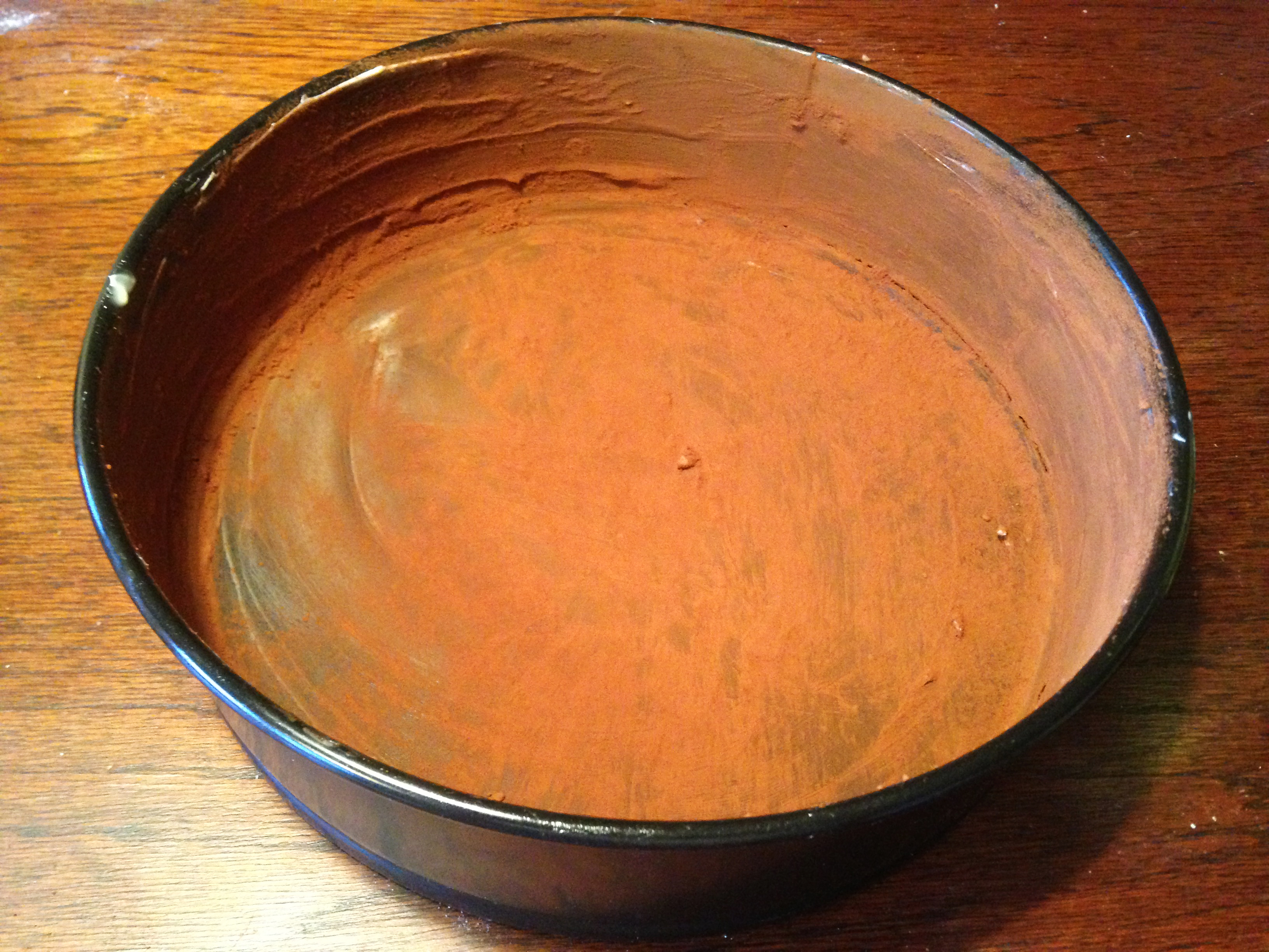 1. Sätt ugnen på 170 grader. Smöra och bröa en form. Jag valde att att ta kakao för att förstärka chokladsmaken. Men givetvis funkar ströbröd också.