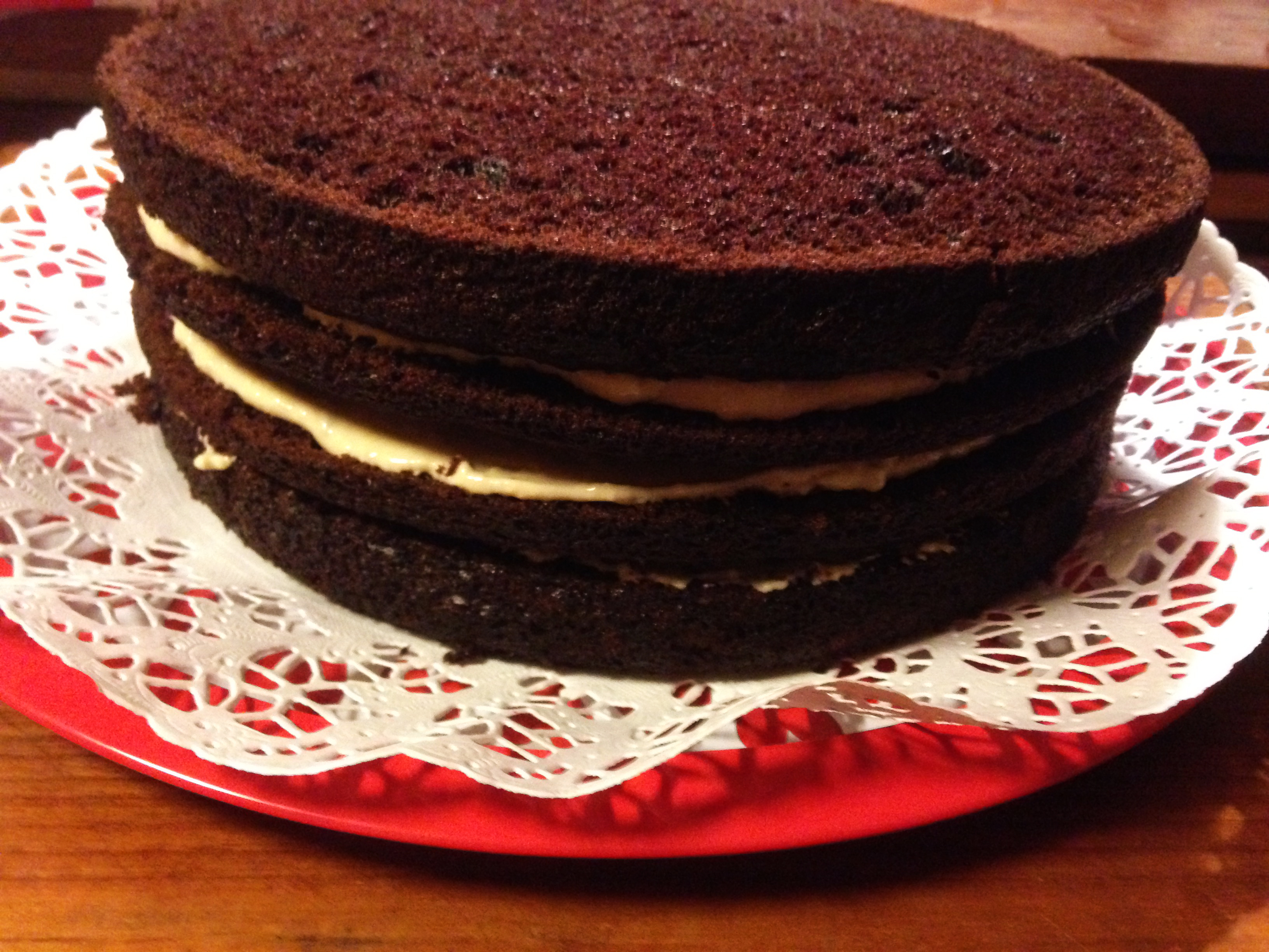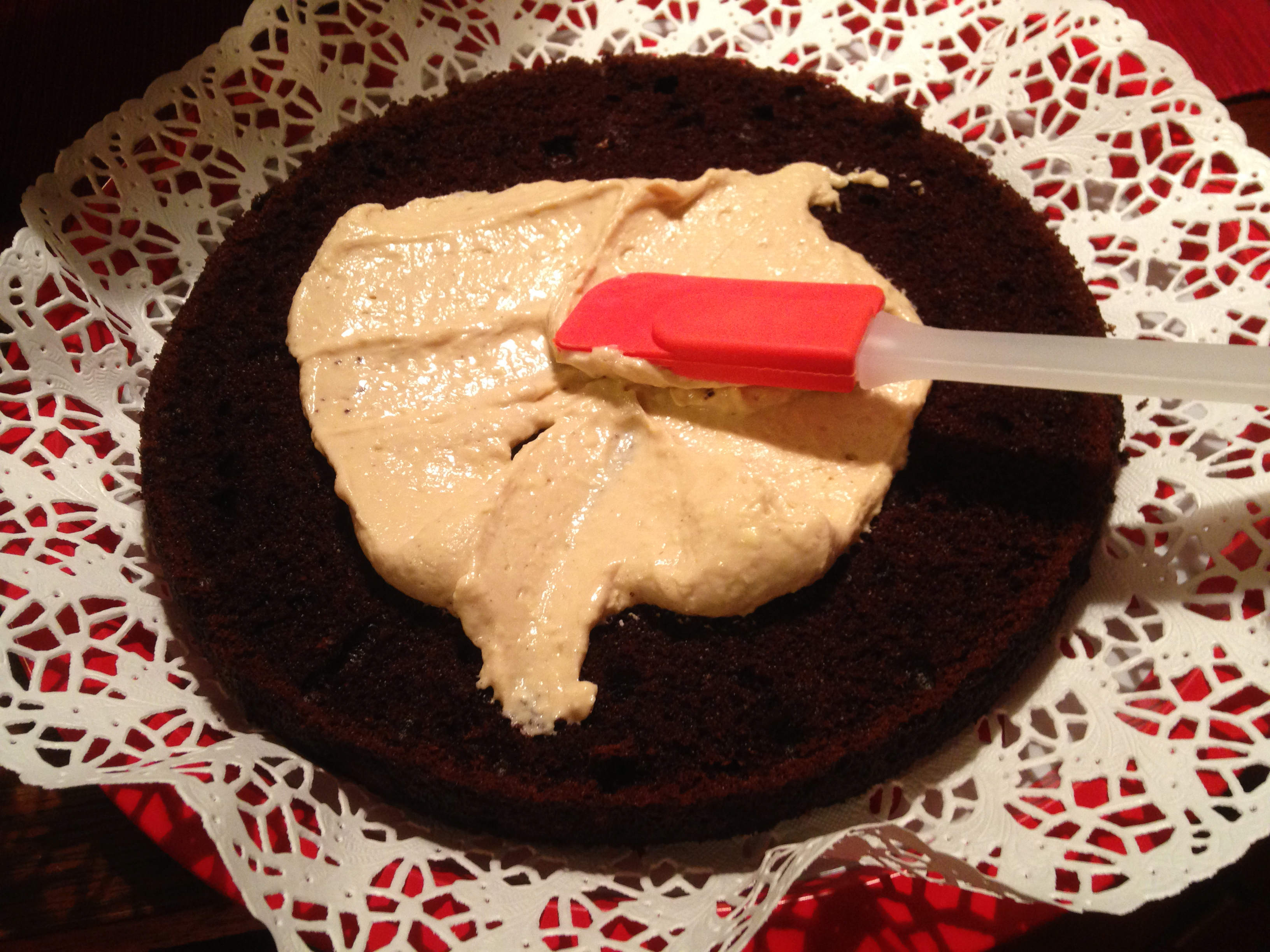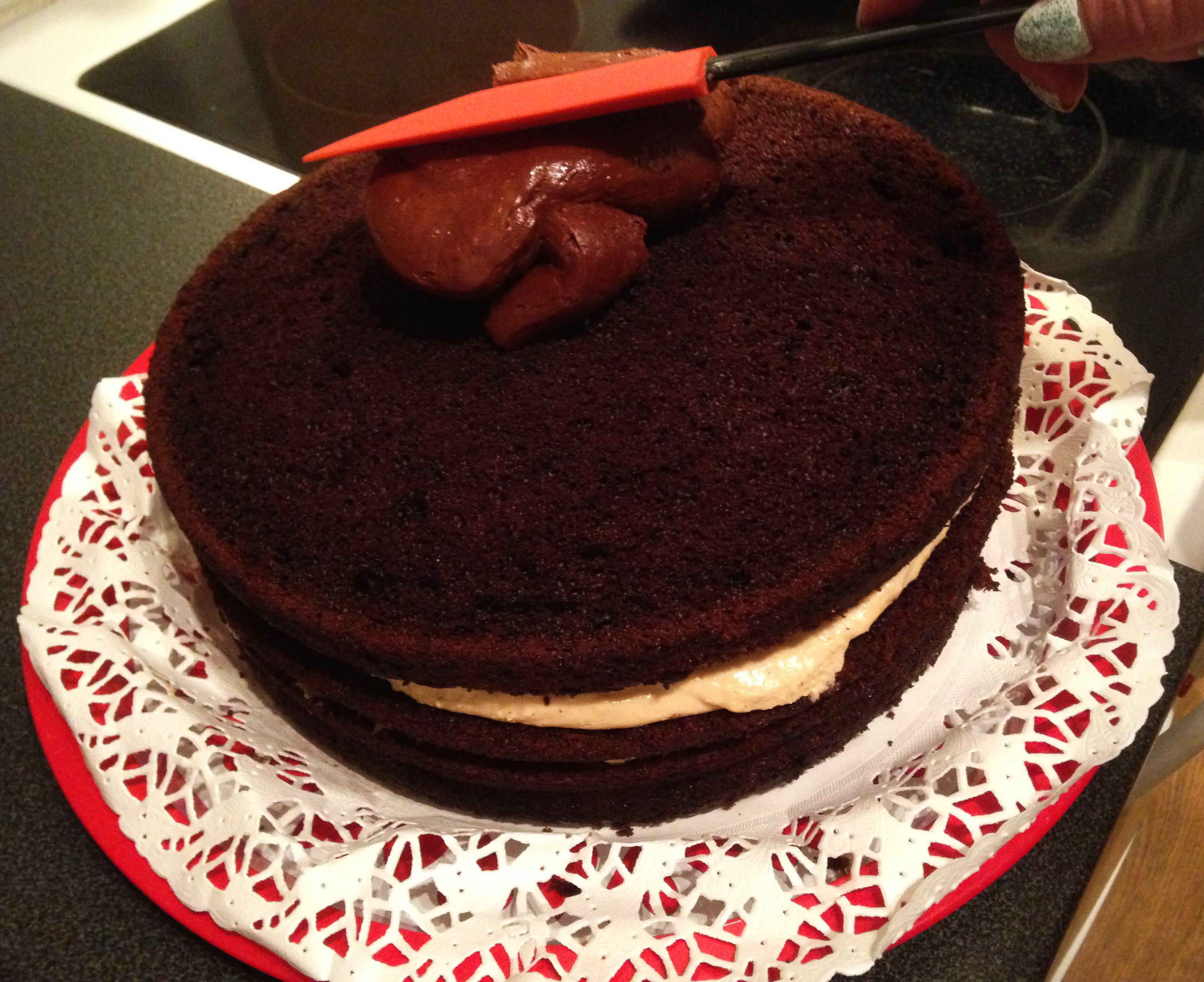Dela bottnarna i två bottnar vardera. Bred ut kaffefrostingen mellan och lägg ihop bottnarna.