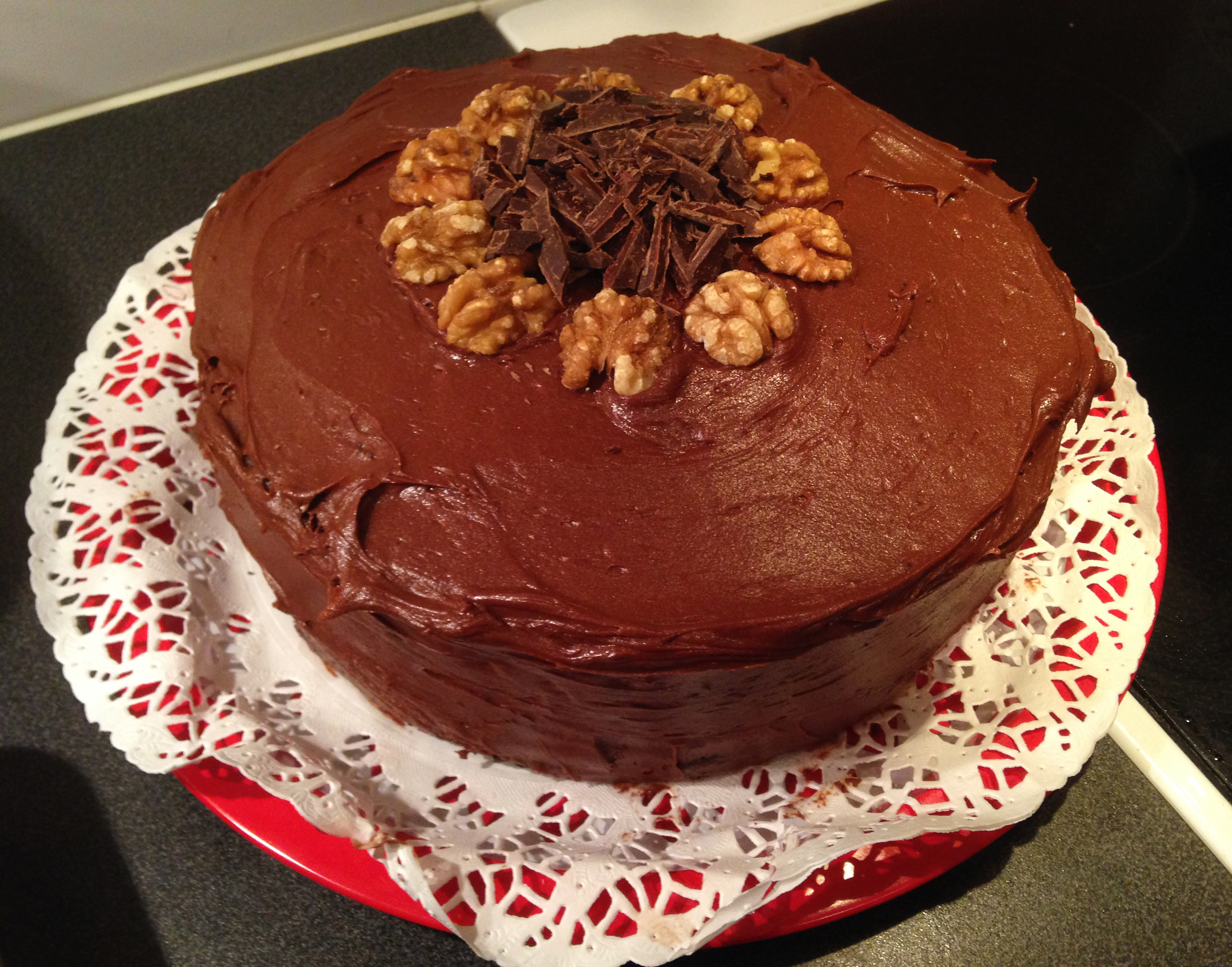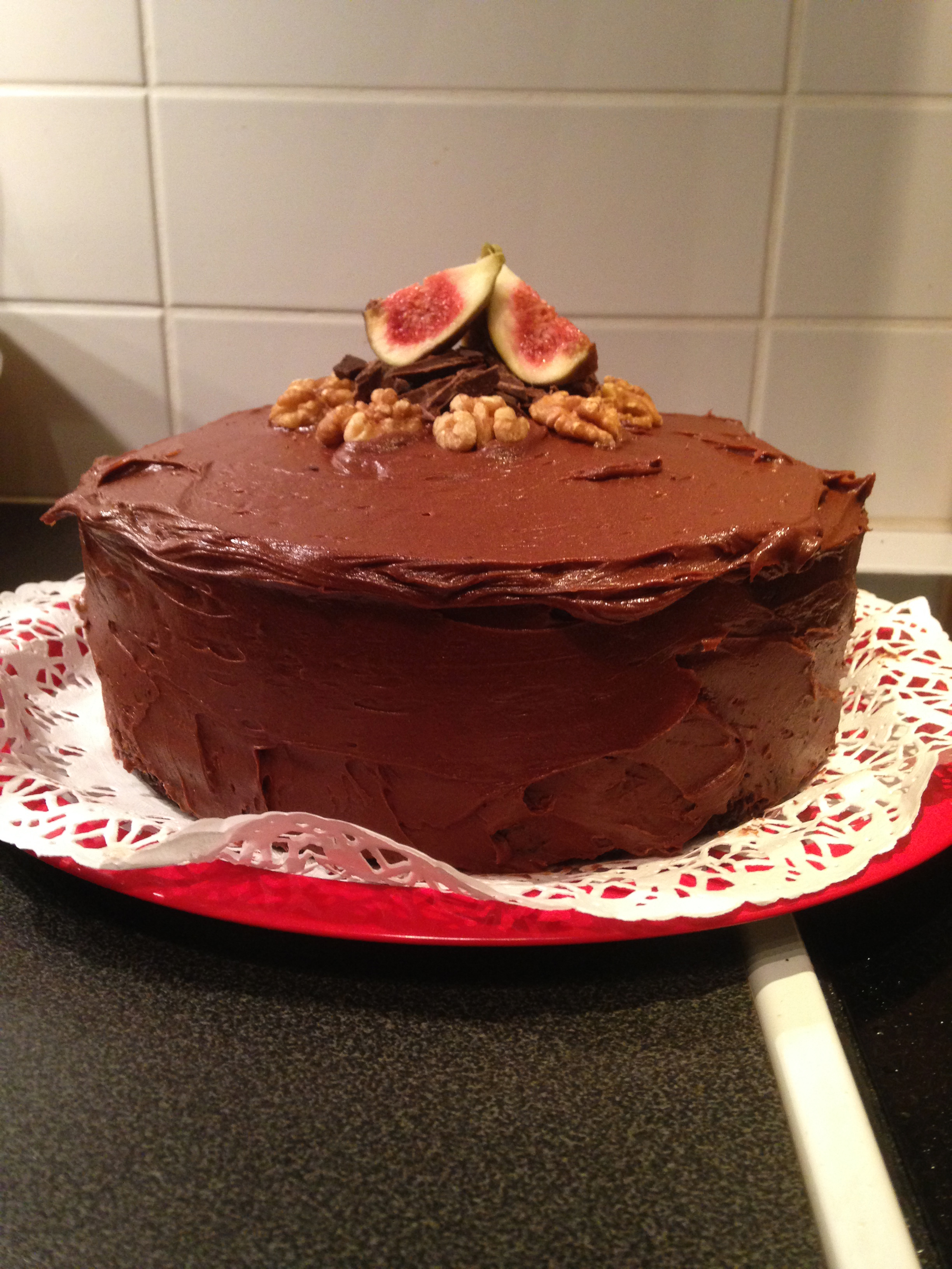11. Bred ut chokladglasyren över tårtan och garnera med fikon, valnötter och hackad choklad.