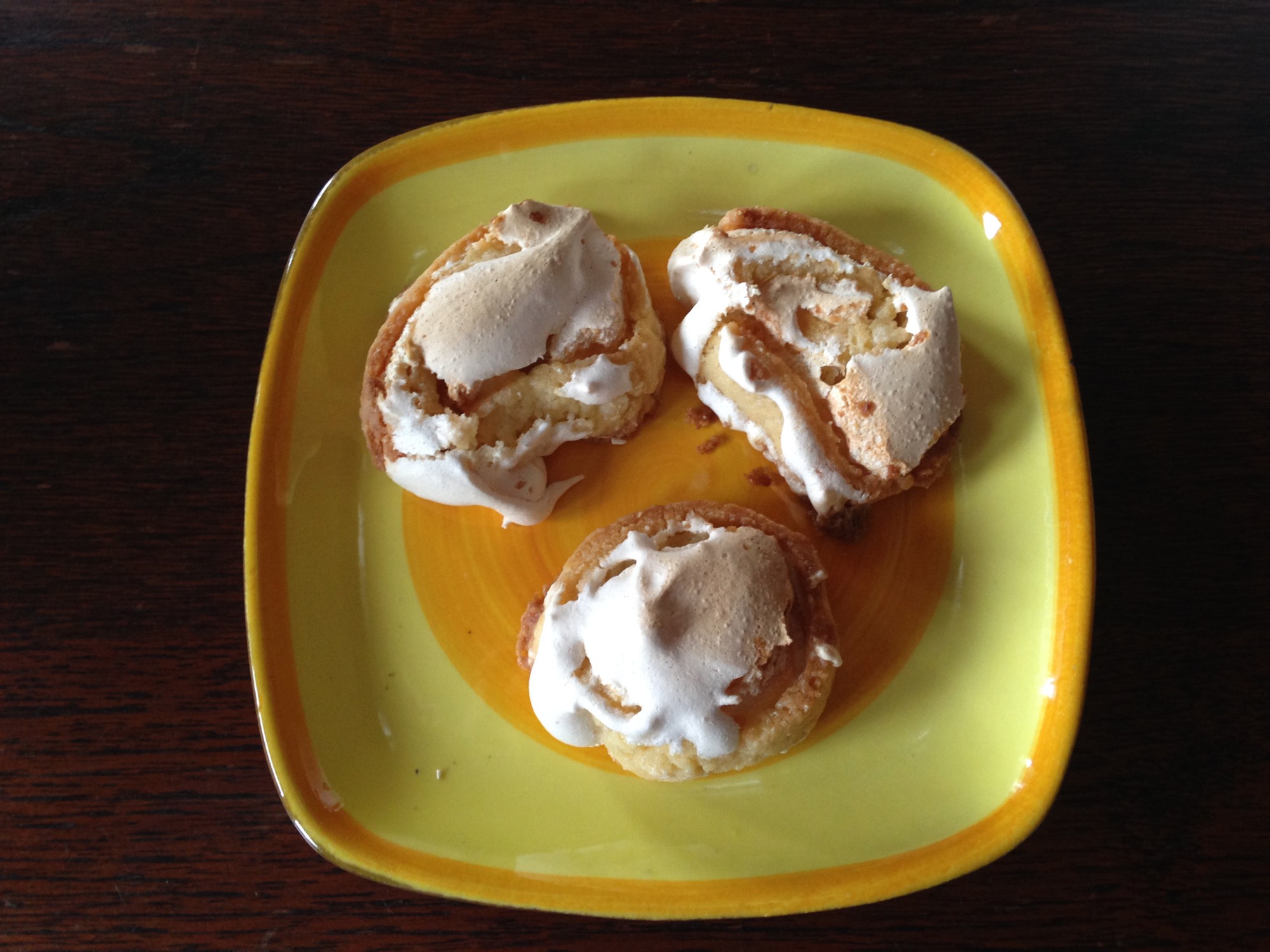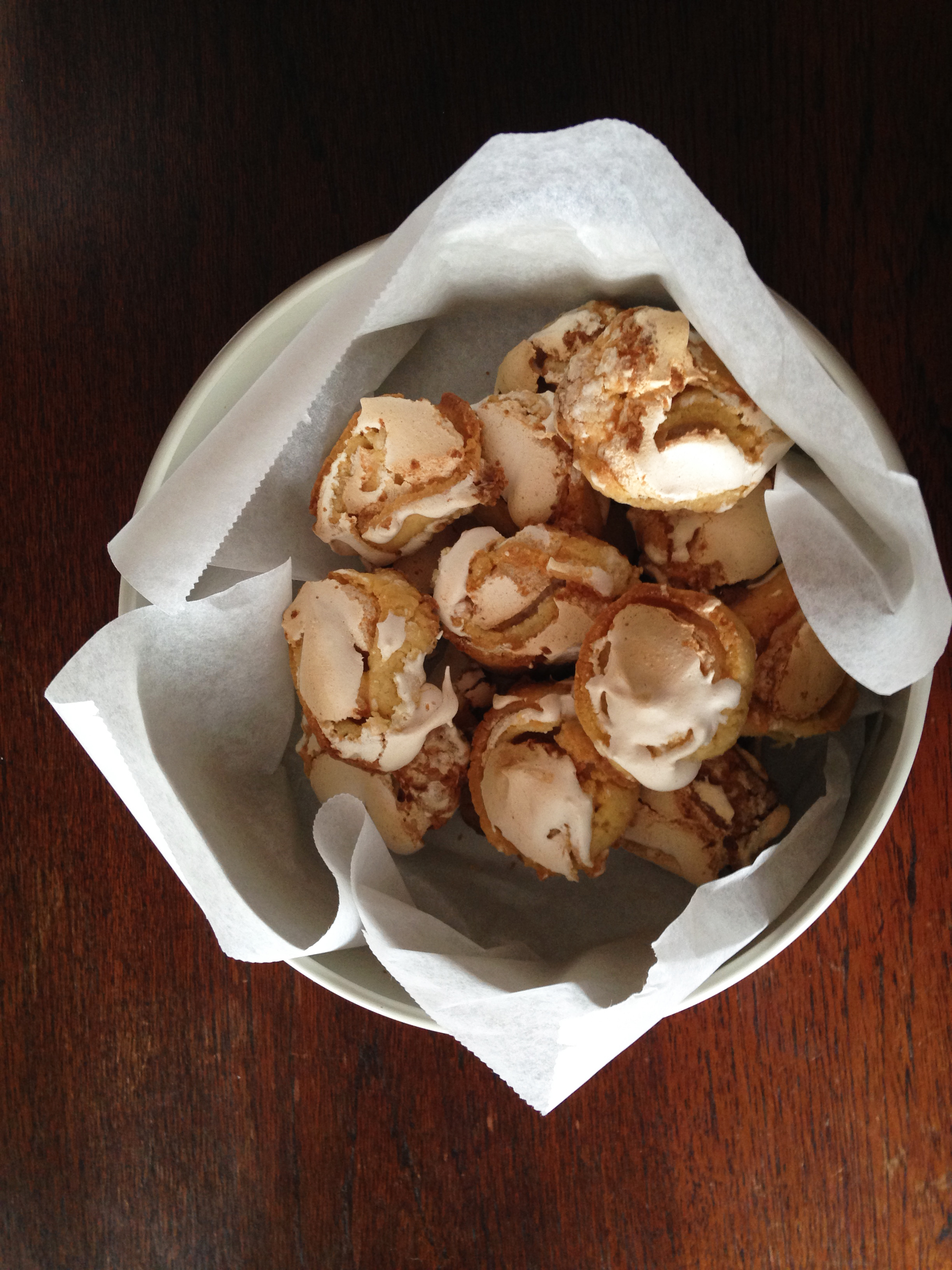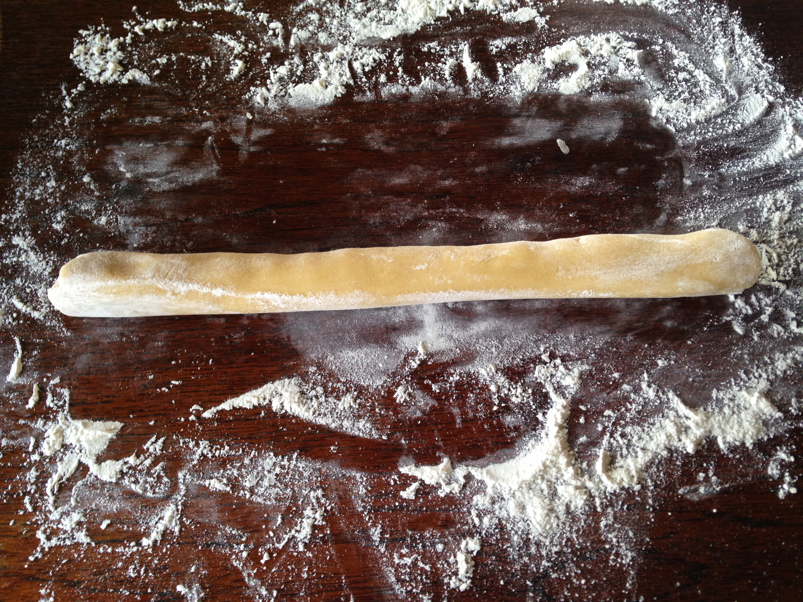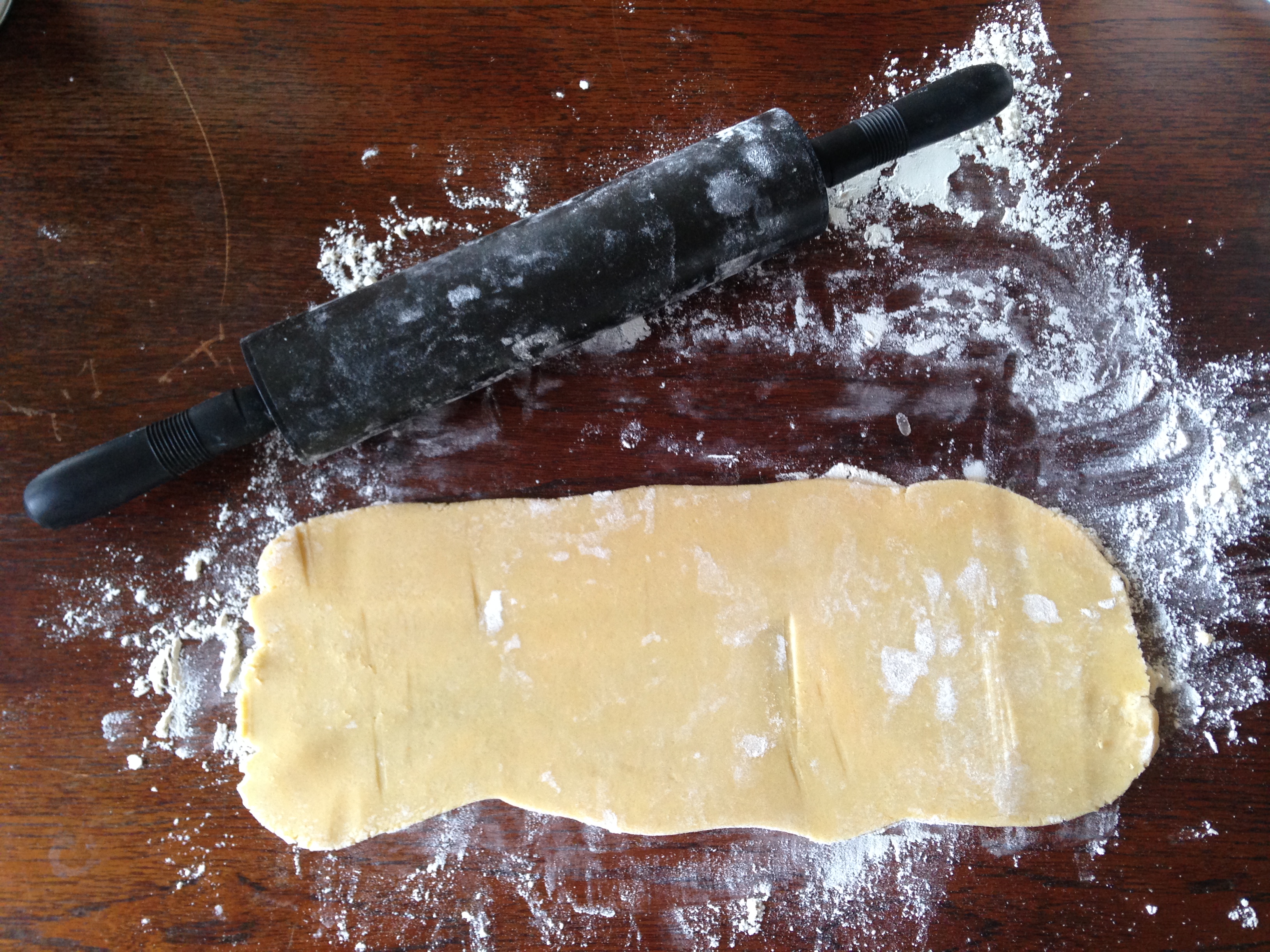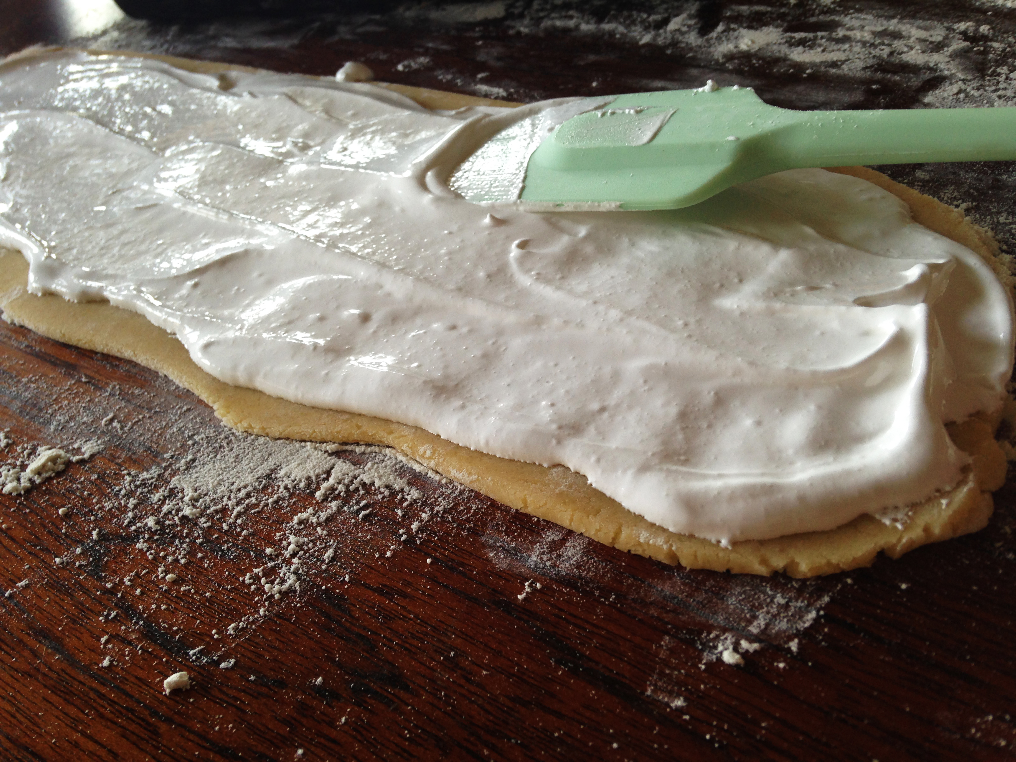 3. Rulla ut mördegen till en ca 30 cm rulle på mjölat bakbord och kavla ut så den är 15 cm bred. Bred ut marängen och rulla ihop från långsidan. Skär ca 1 cm tjocka skivor och lägg dem på en plåt med bakplåtspapper.