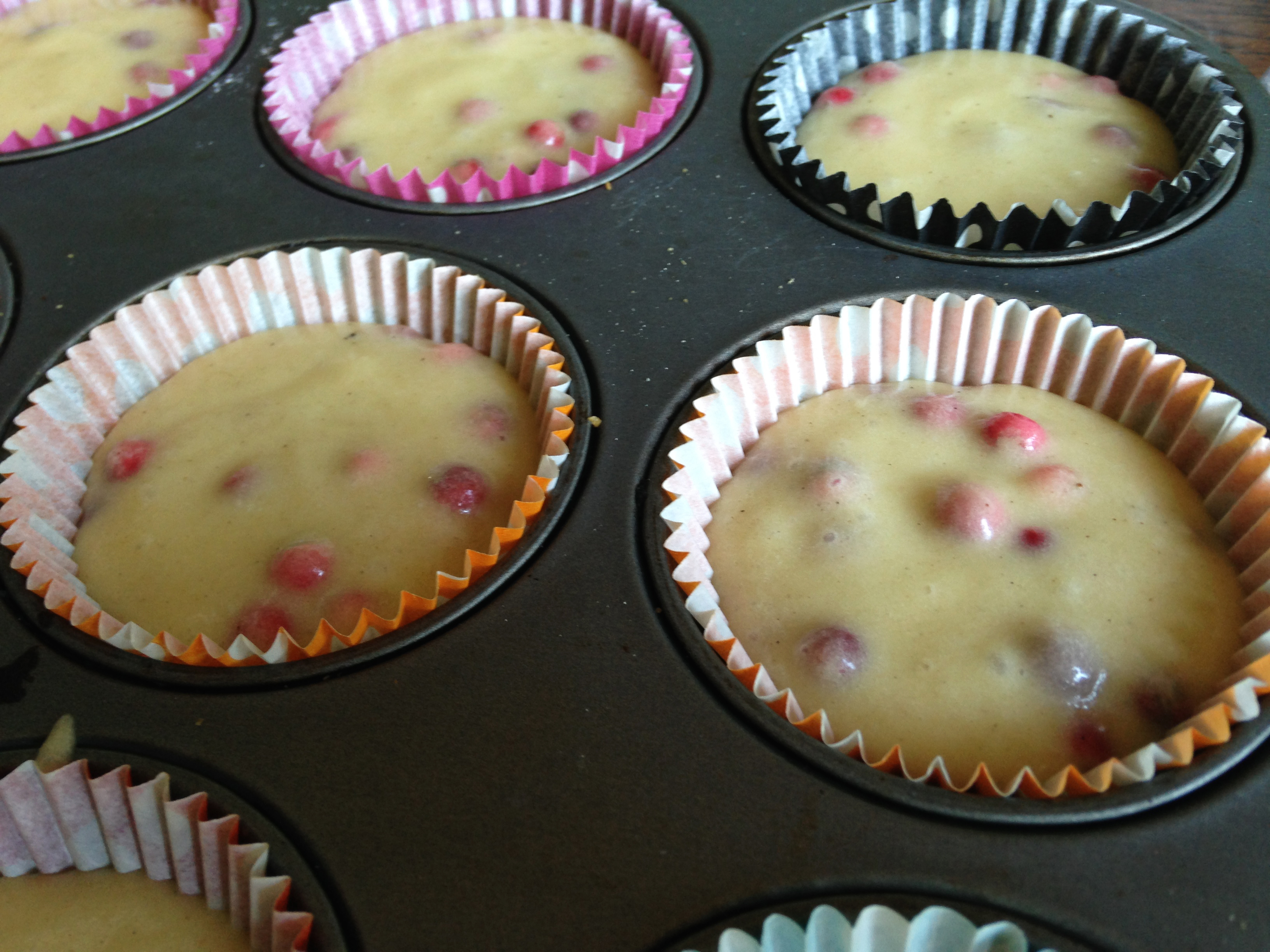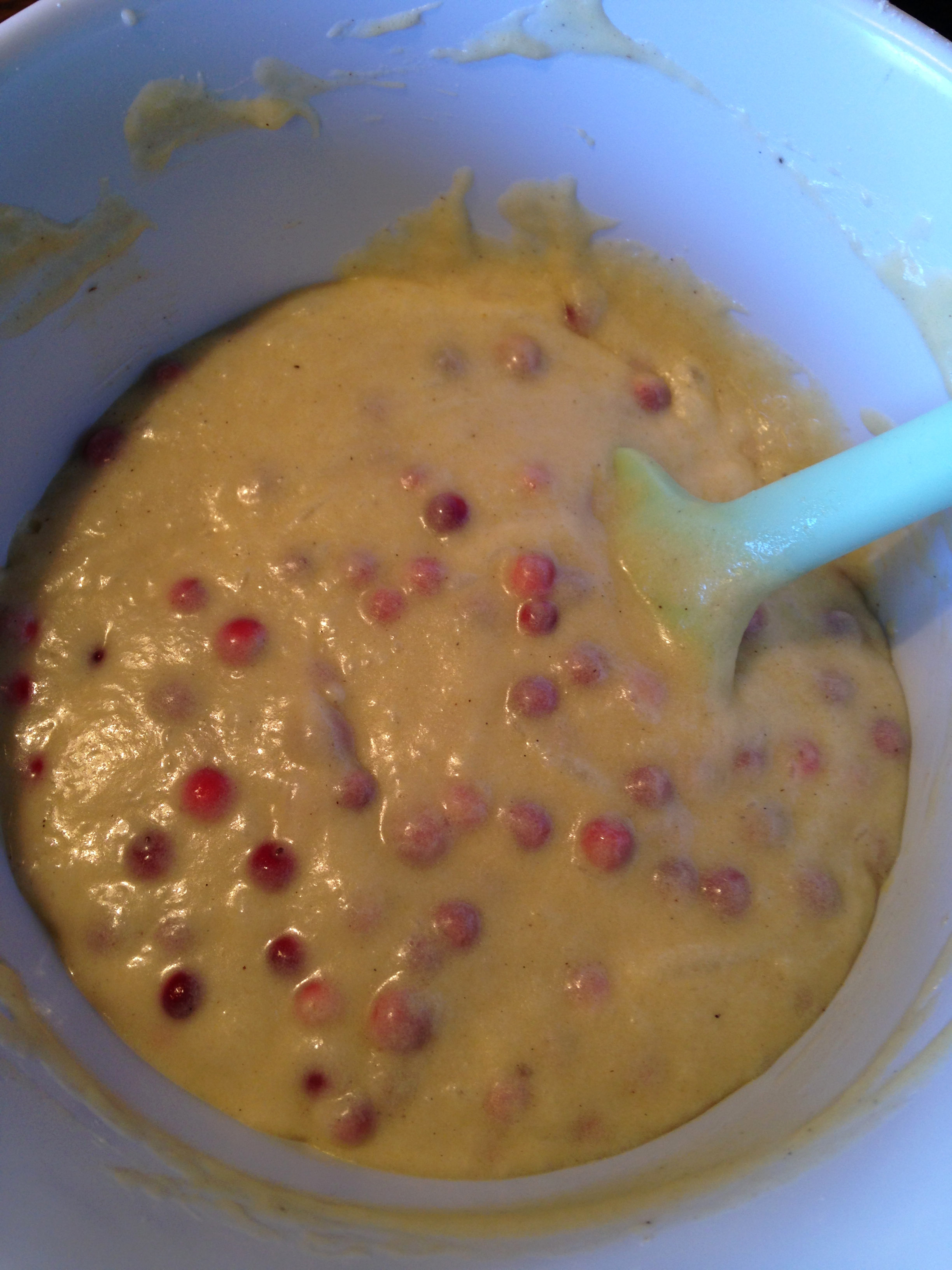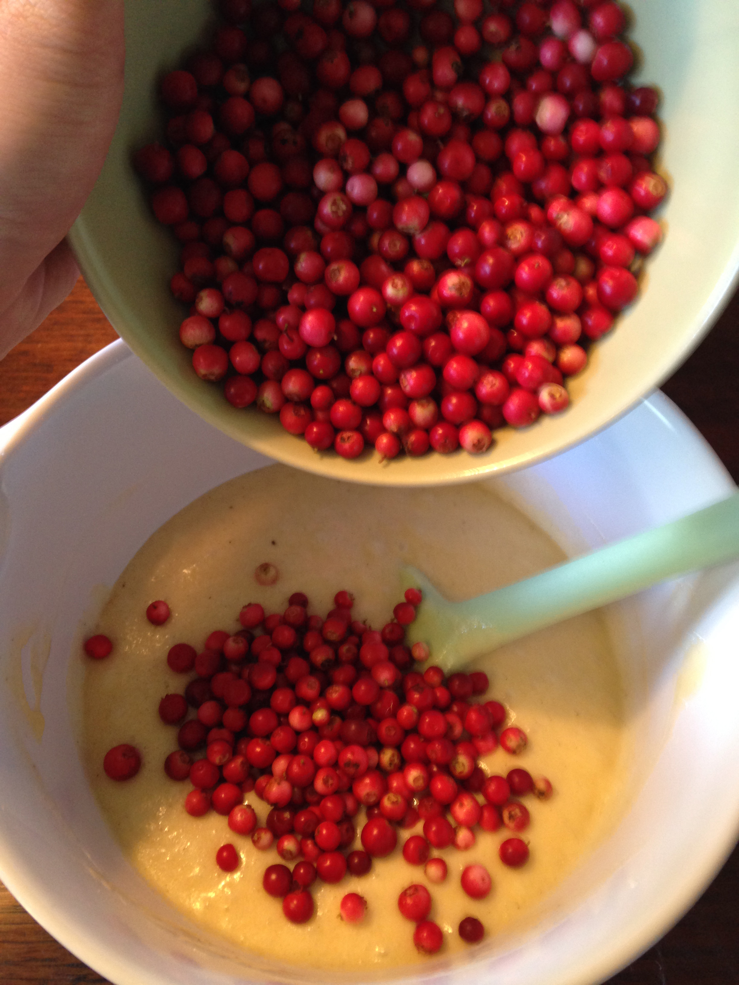 3. Blanda mjöl, bakpulver och vaniljsocker. Rör ner i smeten tillsammans med lingonen.