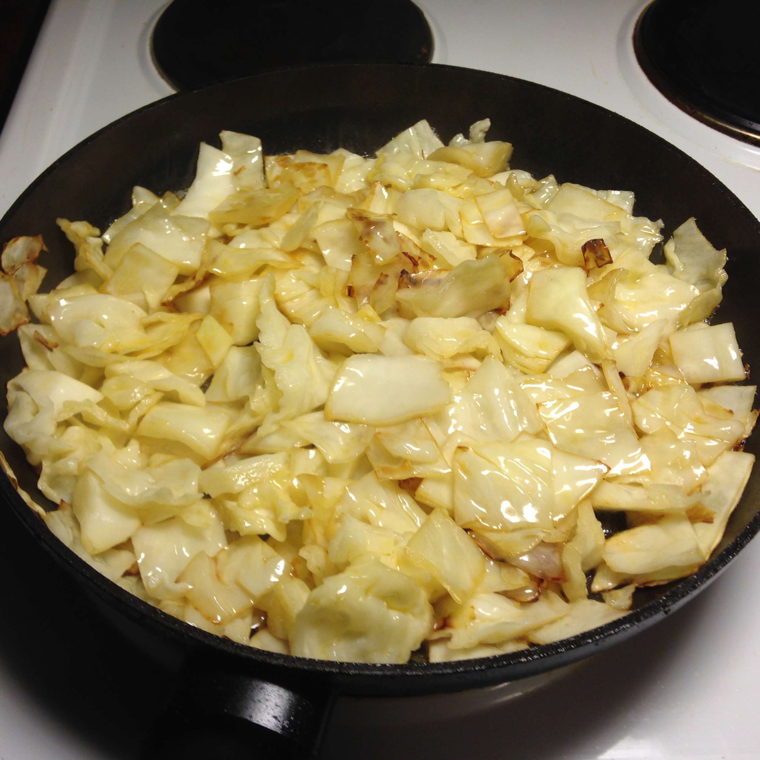 2. Skär kålen i grova bitar och bryn i smör på medelvärme. Låt svalna.
