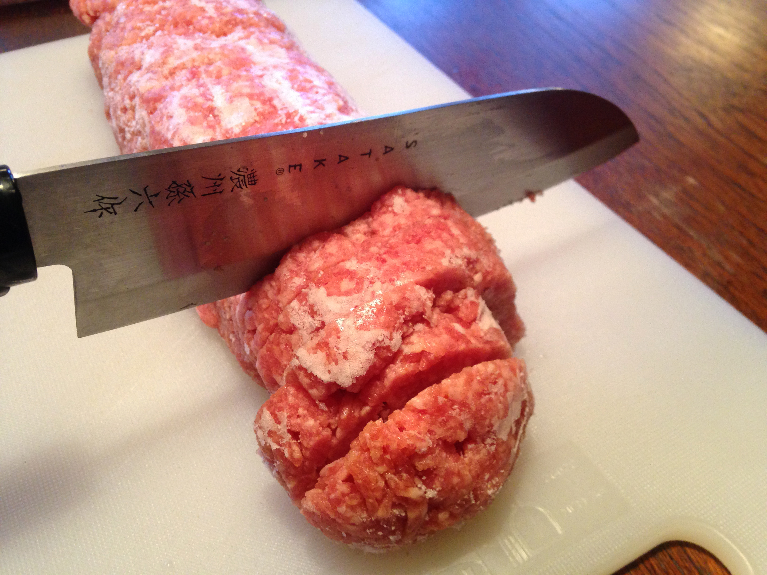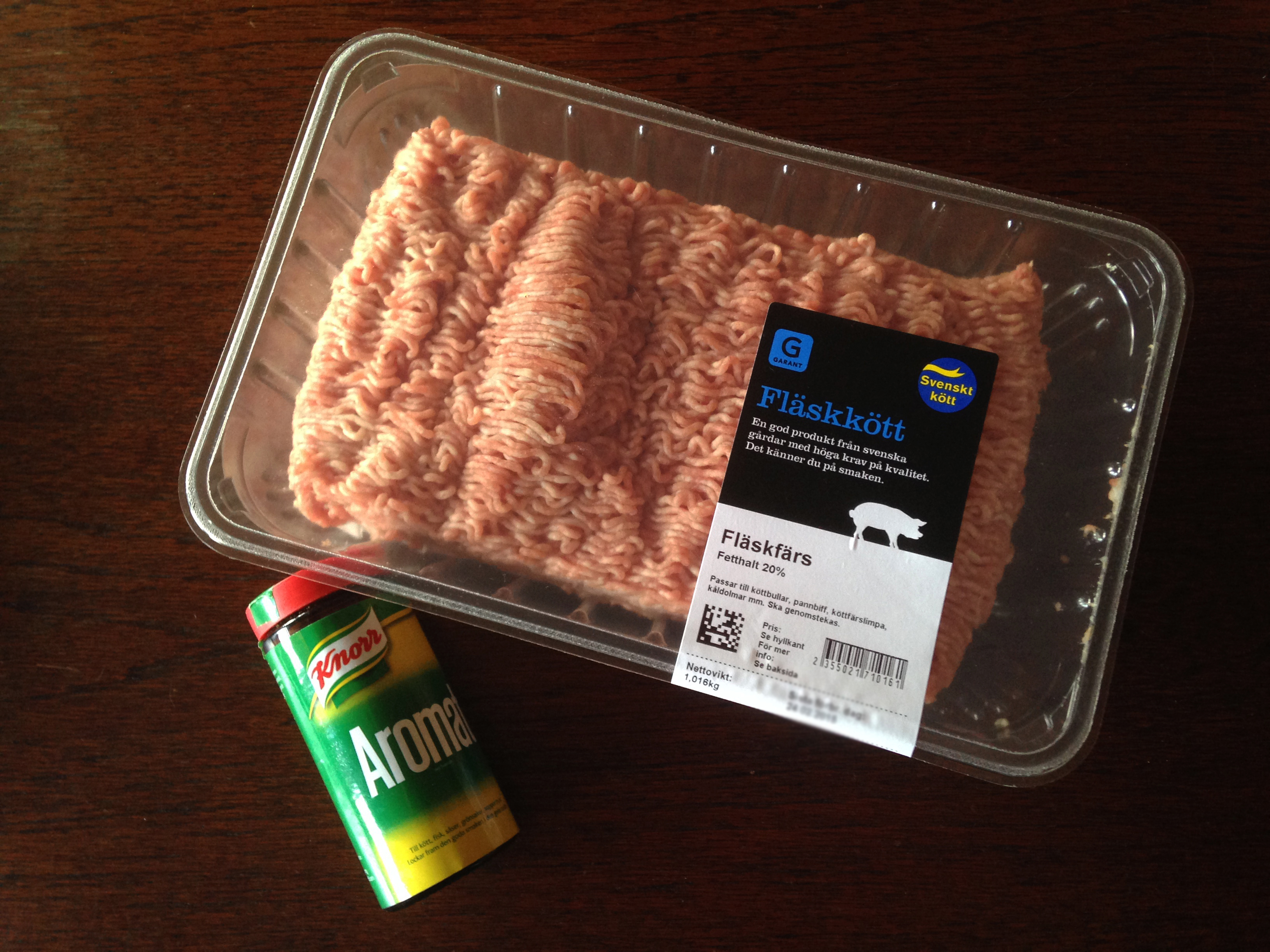 1. Blanda ihop fläskfärsen och aromatkryddan. Rulla ihop till en längd och lägg in i en plastpåse/plastfolie och in i frysen i 4-5 timmar.