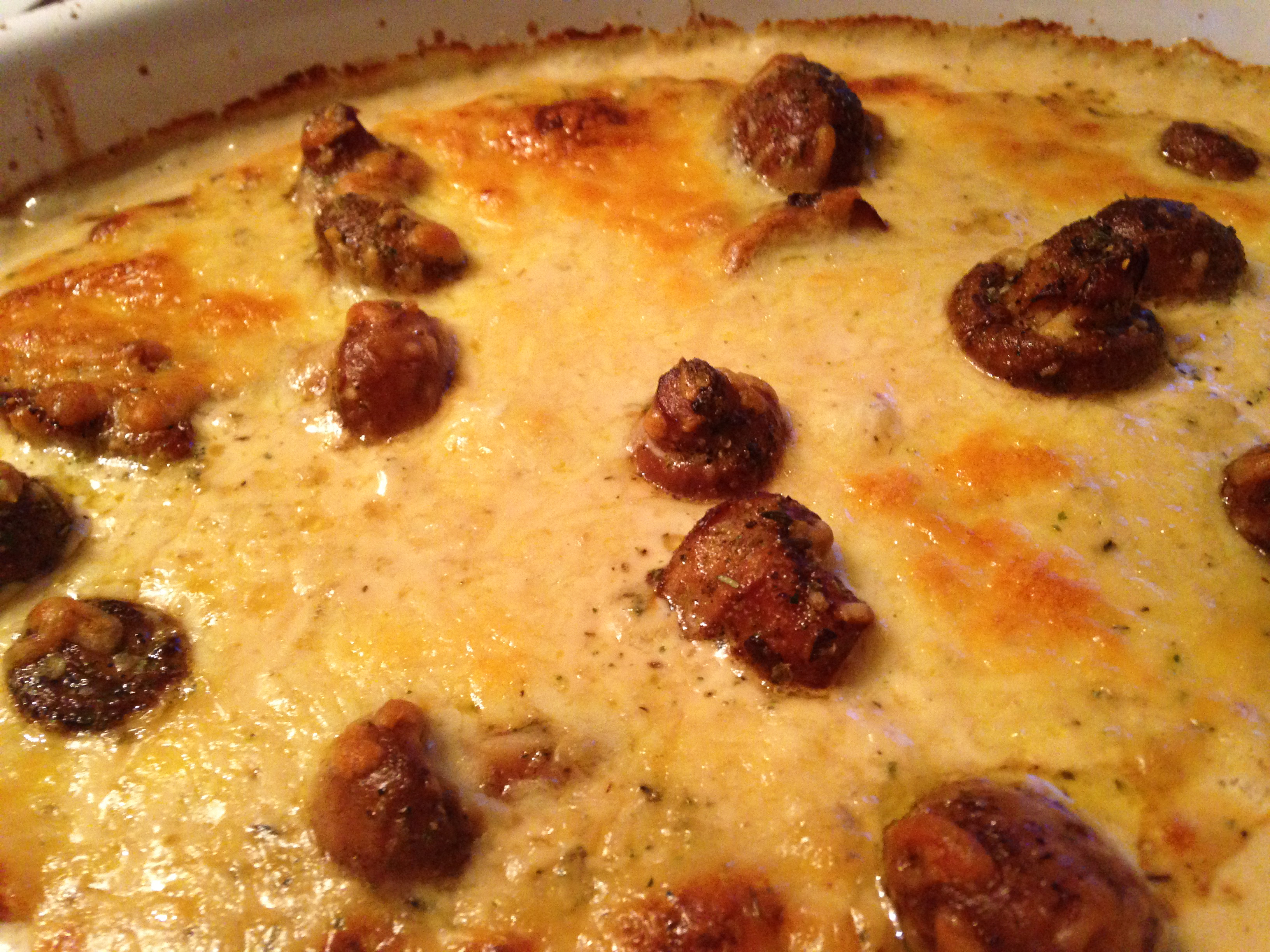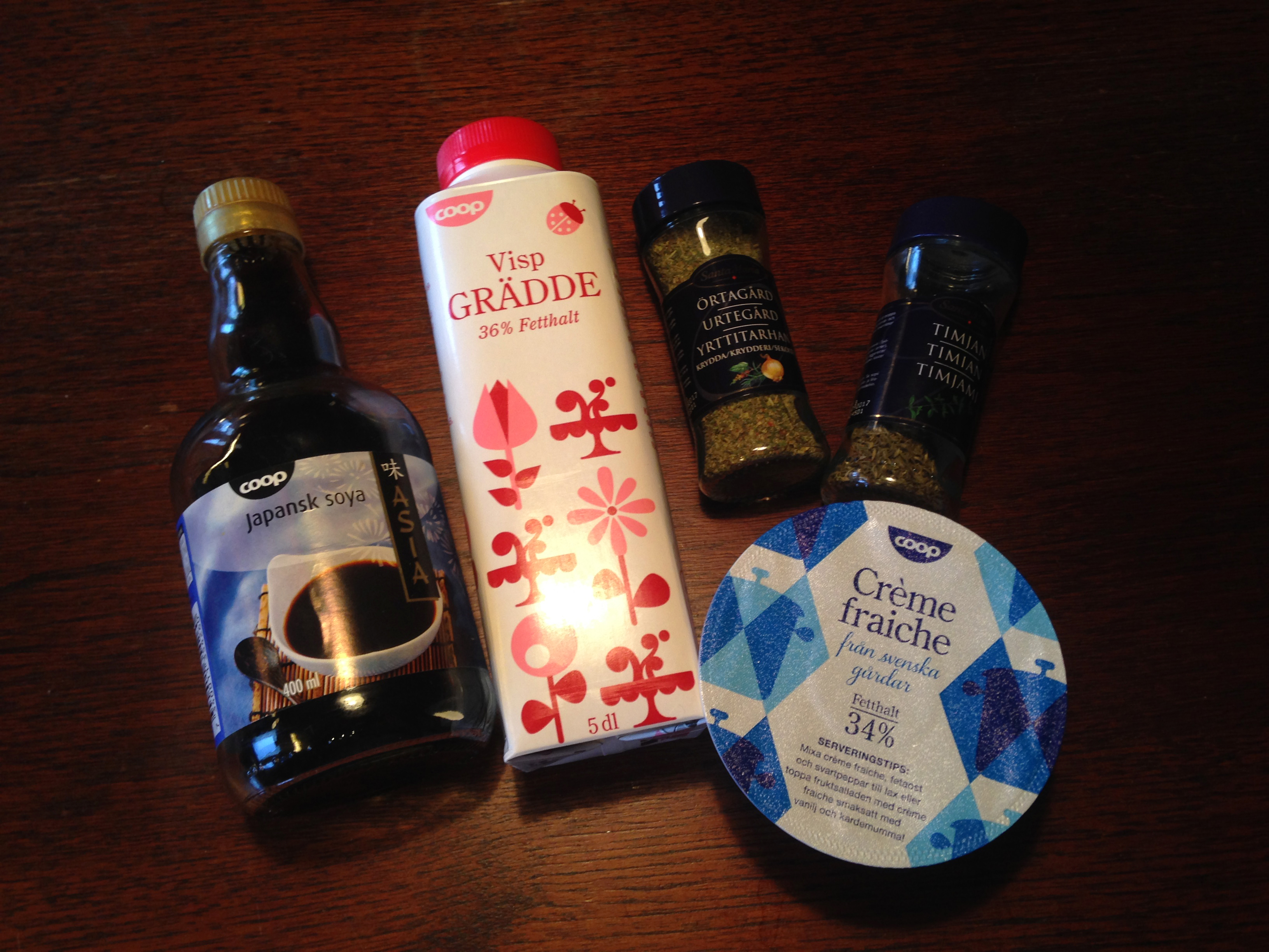 4. Blanda ihop grädde, creme fraiche och sojan. Häll såsen över köttet och svampen. Strö gärna över riven ost.