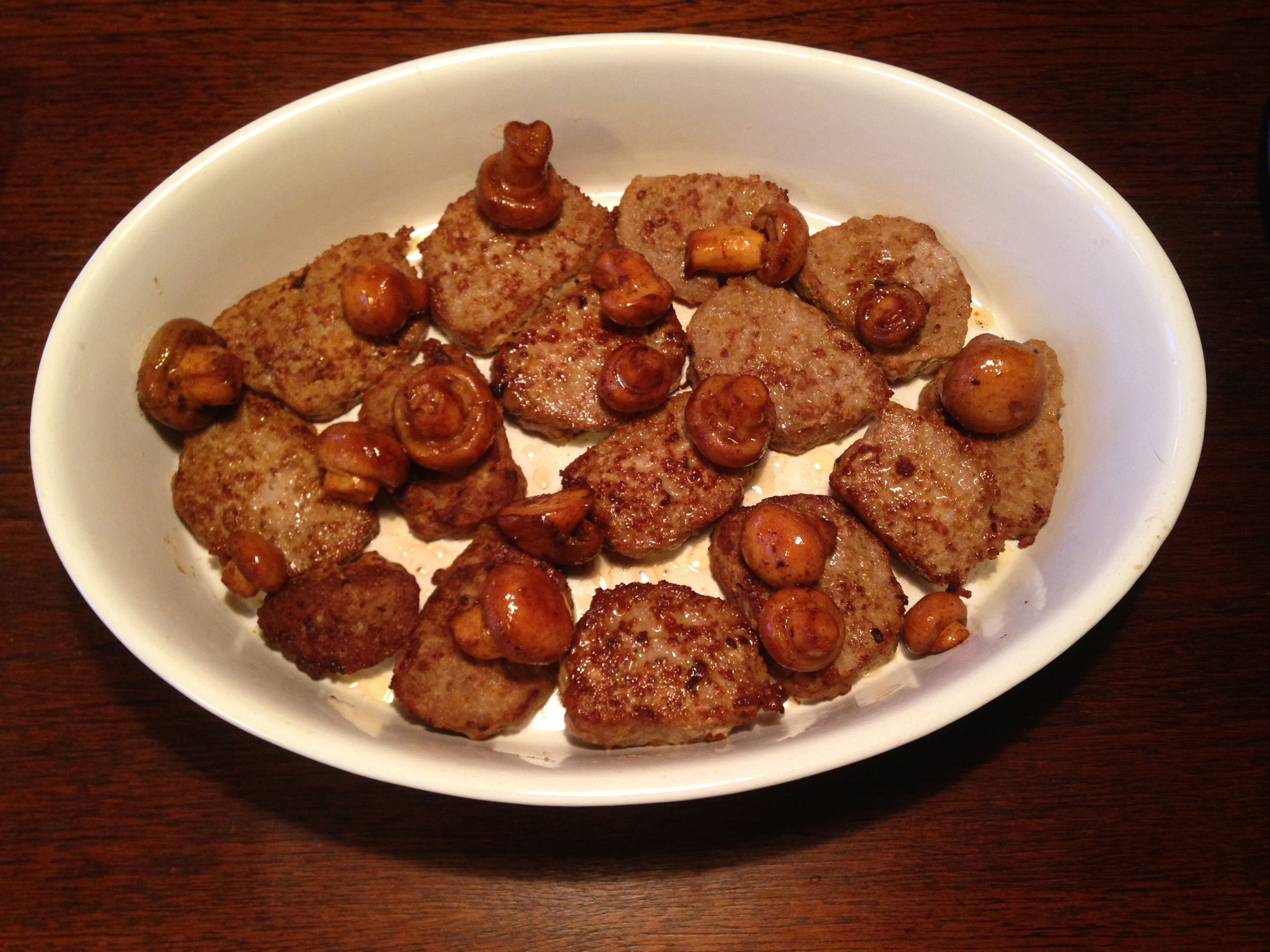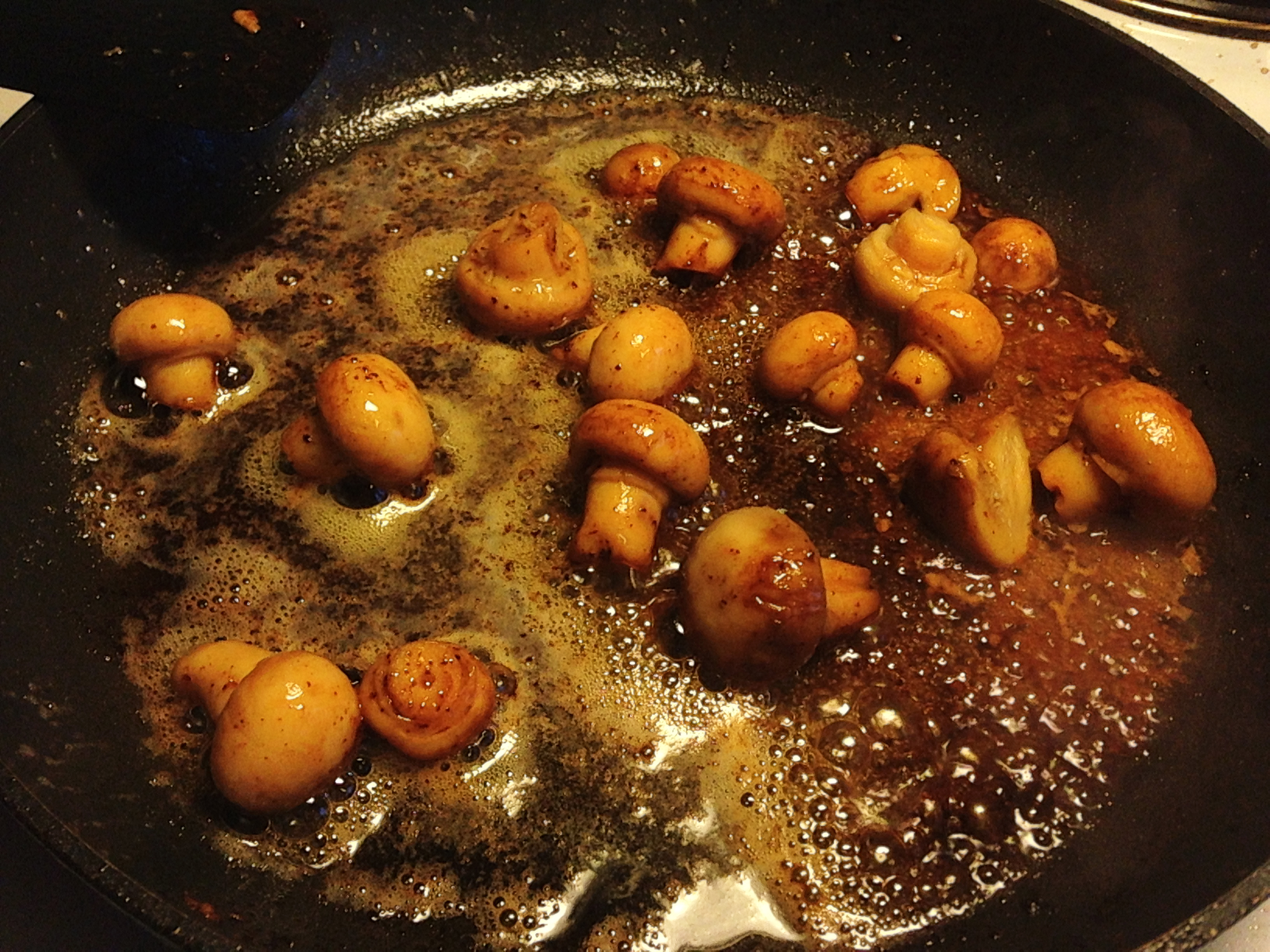3. Stek champinjonerna i smör. Lägg köttet och svampen i en ugnssäker form. Krydda med örtagårdskryddan och timjan.