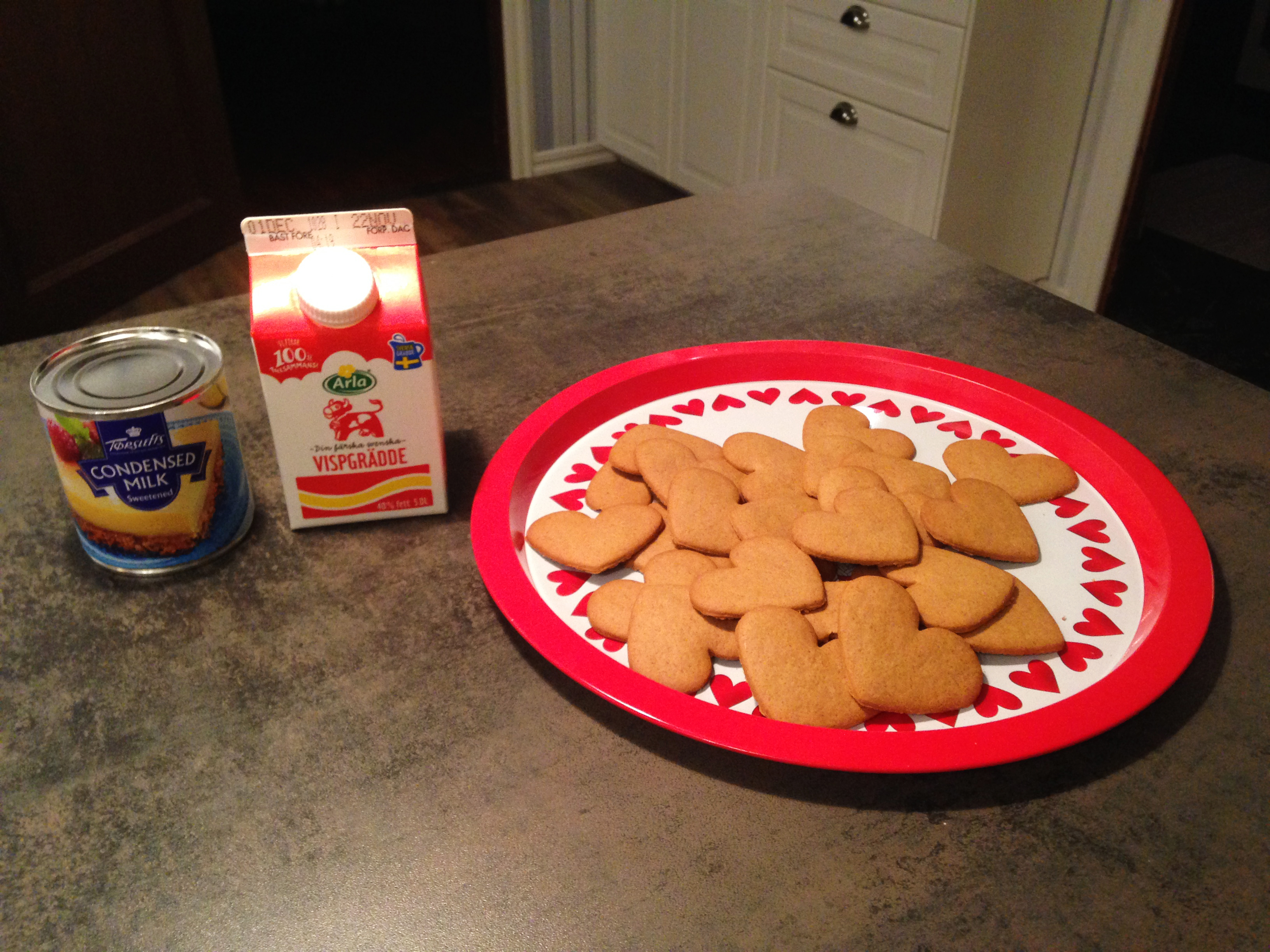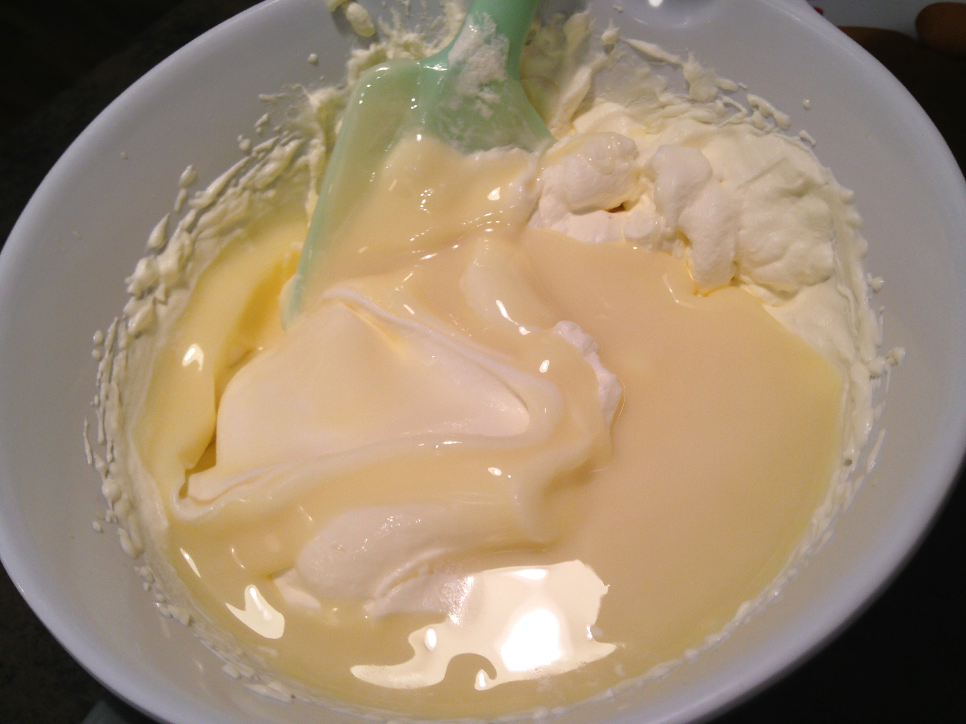 2. Häll ner ned kondenserade mjölken i grädden och blanda noga.